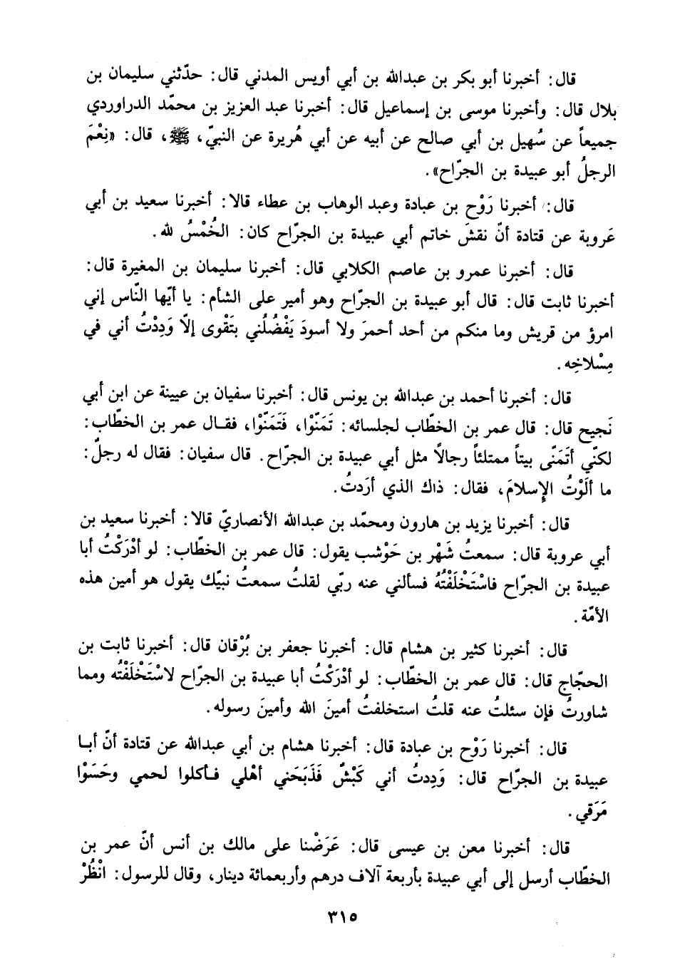 لَكِنِّي أَتَمَنَّى بَيْتًا مُمْتَلِئًا رِجَالا مِثْلَ أَبِي عُبَيْدَةَ بْنِ الْجَرَّاحِ. قَالَ سُفْيَانُ: فَقَالَ لَهُ رَجُلٌ: