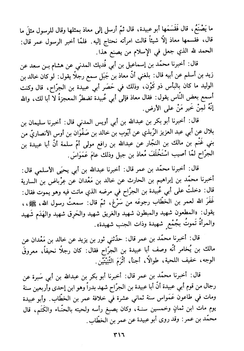 قَالَ: أَخْبَرَنَا مُحَمَّدُ بْنُ عُمَرَ قَالَ: أَخْبَرَنَا أَبُو بَكْرِ بْنُ عَبْدِ اللَّهِ بْنِ أَبِي سَبْرَةَ عَنْ رِجَالٍ مِنْ قَوْمِ أَبِي عُبَيْدَةَ أَنَّ أَبَا عُبَيْدَةَ بْنَ الْجَرَّاحِ شَهِدَ بَدْرًا وَهُوَ ابْنُ إِحْدَى وَأَرْبَعِينَ سَنَةً وَمَاتَ فِي طَاعُونِ عَمَوَاسَ سَنَةَ ثَمَانِي عَشْرَةَ فِي خلافة عمر بن الْخَطَّابِ. وَأَبُو عُبَيْدَةَ يَوْمَ مَاتَ ابْنُ ثَمَانٍ وَخَمْسِينَ سَنَةً. وَكَانَ يَصْبُغُ رَأْسَهُ وَلِحْيَتَهُ بِالْحِنَّاءِ وَالْكَتَمِ. قَالَ مُحَمَّدُ بْنُ عُمَرَ: وَقَدْ رَوَى أَبُو عُبَيْدَةَ عَنْ عُمَرَ بْنِ الْخَطَّابِ.