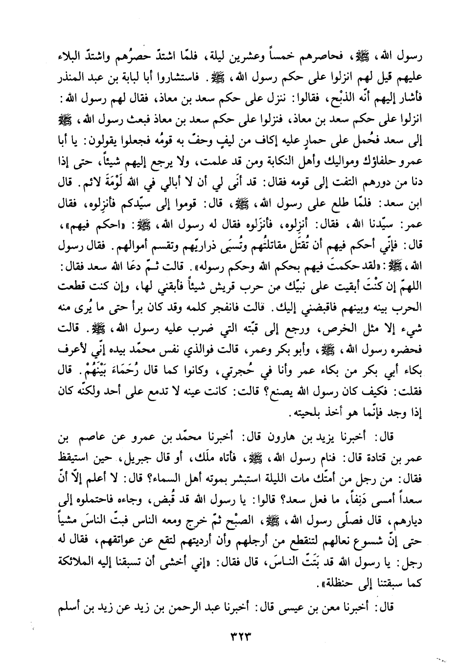 قَالَ: أَخْبَرَنَا يَزِيدُ بْنُ هَارُونَ قَالَ: أَخْبَرَنَا مُحَمَّدُ بن عمرو عَنْ عَاصِمِ بْنِ عُمَرَ بْنِ قَتَادَةَ قَالَ: فَنَامَ رَسُولُ اللَّهِ - صَلَّى اللَّهُ عَلَيْهِ وَسَلَّمَ - فَأَتَاهُ مَلَكٌ. أَوْ قَالَ جِبْرِيلُ. حِينَ اسْتَيْقَظَ فَقَالَ: مَنْ رَجُلٌ مِنْ أُمَّتِكَ مَاتَ اللَّيْلَةَ اسْتَبْشَرَ بِمَوْتِهِ أَهْلُ السَّمَاءِ؟ قَالَ: لا أَعْلَمُ إِلا أَنَّ سَعْدًا أَمْسَى دَنِفًا. مَا فَعَلَ سَعْدٌ؟ قَالُوا: يَا رَسُولَ اللَّهِ قَدْ قُبِضَ. وَجَاءَهُ فَاحْتَمَلُوهُ إِلَى دِيَارِهِمْ. قَالَ فَصَلَّى رَسُولُ اللَّهِ - صَلَّى اللَّهُ عَلَيْهِ وَسَلَّمَ - الصُّبْحَ ثُمَّ خَرَجَ وَمَعَهُ النَّاسُ فَبَتَّ النَّاسَ مَشْيًا حَتَّى إِنَّ شُسُوعَ نِعَالِهِمْ لَتَنْقَطِعُ مِنْ أَرْجُلِهِمْ وَإِنَّ أَرْدِيَتَهُمْ لَتَقَعُ عَنْ عَوَاتِقِهِمْ. فَقَالَ لَهُ رَجُلٌ: [يَا رَسُولَ اللَّهِ قَدْ بَتَتَّ النَّاسَ. قَالَ فَقَالَ: إِنِّي أَخْشَى أَنْ تَسْبِقَنَا إِلَيْهِ الْمَلائِكَةُ كَمَا سَبَقَتْنَا إِلَى حَنْظَلَةَ] .