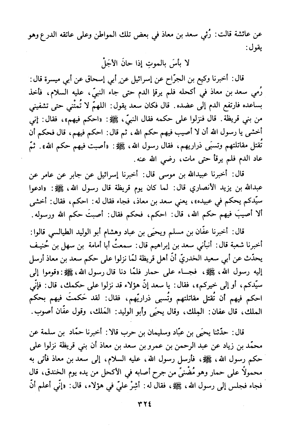 رُمِيَ سَعْدُ بْنُ مُعَاذٍ فِي أَكْحَلِهِ فلم يرقأ الدم حتى جاء النبي. ع. فَأَخَذَ بِسَاعِدِهِ فَارْتَفَعَ الدَّمُ إِلَى عَضُدِهِ. قَالَ فَكَانَ سَعْدٌ يَقُولُ: اللَّهُمَّ لا تُمِتْنِي حَتَّى تَشْفِيَنِي مِنْ بَنِي قُرَيْظَةَ. قَالَ فَنَزَلُوا عَلَى حكمه [فقال النبي. ص: احْكُمْ فِيهِمْ. فَقَالَ: إِنِّي أَخْشَى يَا رَسُولَ اللَّهِ أَنْ لا أُصِيبَ فِيهِمْ حُكْمَ اللَّهِ. ثُمَّ قَالَ: احْكُمْ فِيهِمْ. قَالَ فَحَكَمَ أَنْ تُقْتَلَ مُقَاتِلَتُهُمْ وَتُسْبَى ذَرَارِيُّهُمْ. فَقَالَ رَسُولُ اللَّهِ. ص: أَصَبْتَ فِيهِمْ حُكْمَ اللَّهِ] . ثُمَّ عَادُ الدَّمُ فَلَمْ يَرْقَأْ حَتَّى مَاتَ. رَضِيَ اللَّهُ عَنْهُ.