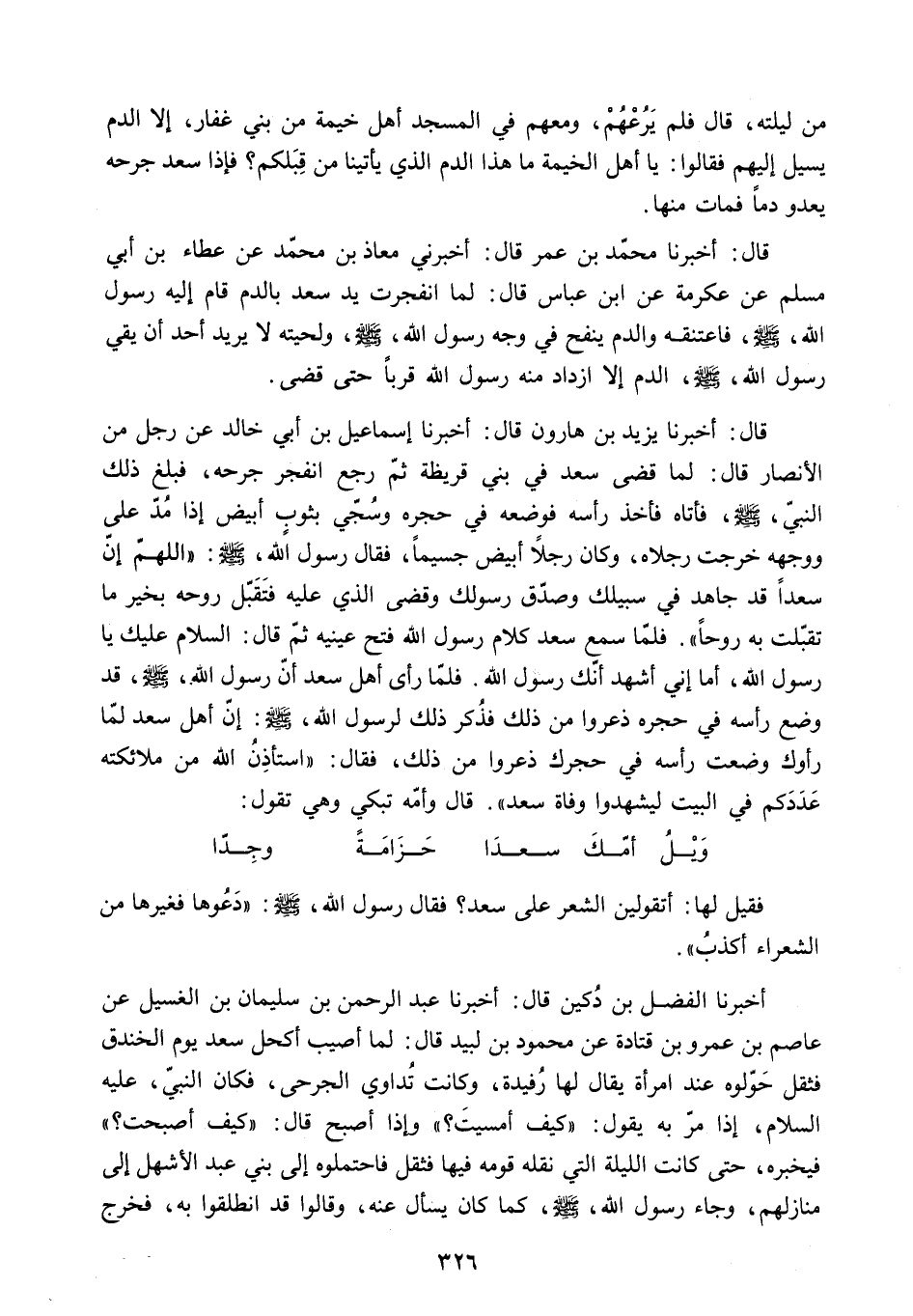 قَالَ: أَخْبَرَنَا يَزِيدُ بْنُ هَارُونَ قَالَ: أَخْبَرَنَا إِسْمَاعِيلُ بْنُ أَبِي خَالِدٍ عَنْ رَجُلٍ مِنَ الأَنْصَارِ قَالَ: لَمَّا قَضَى سَعْدٌ فِي بَنِي قُرَيْظَةَ ثُمَّ رَجَعَ انْفَجَرَ جُرْحُهُ. فَبَلَغَ ذَلِكَ النَّبِيَّ - صَلَّى اللَّهُ عَلَيْهِ وَسَلَّمَ - فَأَتَاهُ فَأَخَذَ رَأْسَهُ فَوَضَعَهُ فِي حِجْرِهِ وَسُجِّيَ بِثَوْبٍ أَبْيَضَ إِذَا مُدَّ عَلَى وَجْهِهِ خَرَجَتْ رِجْلاهُ. وَكَانَ رَجُلا أَبْيَضَ جَسِيمًا. [فَقَالَ رسول الله. ص: اللَّهُمَّ إِنَّ سَعْدًا قَدْ جَاهَدَ فِي سَبِيلِكَ وَصَدَّقَ رَسُولَكَ وَقَضَى الَّذِي عَلَيْهِ فَتَقَبَّلْ رُوحَهُ بِخَيْرِ مَا تَقَبَّلْتَ بِهِ رُوحًا] . فَلَمَّا سَمِعَ سَعْدٌ كَلامَ رَسُولِ اللَّهِ فَتْحَ عَيْنَيْهِ ثُمَّ قَالَ: السَّلامُ عَلَيْكَ يَا رَسُولَ اللَّهِ. أَمَا إِنِّي أَشْهَدُ أَنَّكَ رَسُولُ اللَّهِ. [فَلَمَّا رَأَى أَهْلُ سَعْدٍ أَنَّ رَسُولَ اللَّهِ - صَلَّى اللَّهُ عَلَيْهِ وَسَلَّمَ - قَدْ وَضَعَ رَأْسَهُ فِي حِجْرِهِ ذُعِرُوا مِنْ ذَلِكَ فَذُكِرَ ذَلِكَ لِرَسُولِ اللَّهِ. ص: إِنَّ أَهْلَ سَعْدٍ لَمَّا رَأَوْكَ وَضَعْتَ رَأْسَهُ فِي حِجْرِكَ ذُعِرُوا مِنْ ذَلِكَ. فَقَالَ: اسْتَأْذِنُ اللَّهَ مِنْ مَلائِكَتِهِ عَدَدُكُمْ فِي الْبَيْتِ لِيَشْهَدُوا وَفَاةَ سَعْدٍ] . قَالَ وَأُمُّهُ تَبْكِي وَهِيَ تَقُولُ: