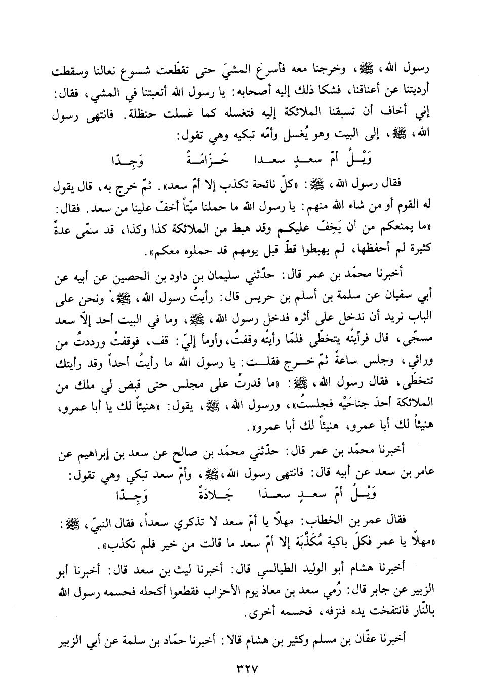 [مَهْلا يَا عُمَرُ فَكُلُّ بَاكِيَةٍ مُكَذَّبَةٌ إِلا أُمَّ سَعْدٍ مَا قَالَتْ مِنْ خَيْرٍ فَلَمْ تكذب] .