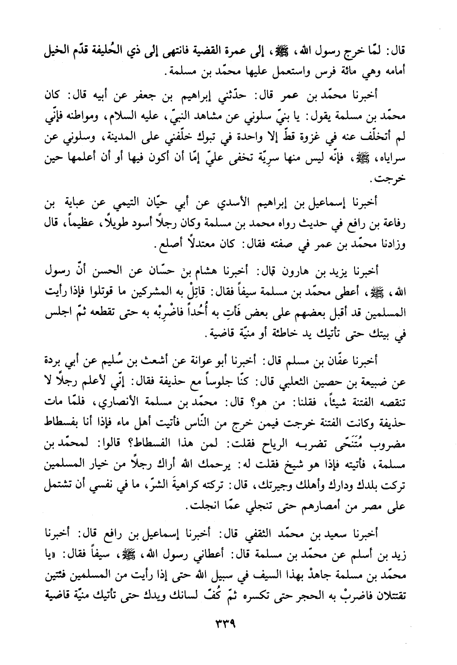 أَخْبَرَنَا مُحَمَّدُ بْنُ عُمَرَ قَالَ: حَدَّثَنِي إِبْرَاهِيمُ بْنُ جَعْفَرٍ عَنْ أَبِيهِ قَالَ: كَانَ مُحَمَّدُ بْنُ مَسْلَمَةَ يَقُولُ: يَا بَنِيَّ سَلُونِي عَنْ مَشَاهِدِ النبي. ع. وَمَوَاطِنِهِ فَإِنِّي لَمْ أَتَخَلَّفْ عَنْهُ فِي غَزْوَةٍ قَطُّ إِلا وَاحِدَةً فِي تَبُوكَ خَلَّفَنِي عَلَى الْمَدِينَةِ. وَسَلُونِي عَنْ سَرَايَاهُ - صَلَّى اللَّهُ عَلَيْهِ وَسَلَّمَ - فَإِنَّهُ لَيْسَ مِنْهَا سَرِيَّةٌ تَخْفَى عَلَيَّ إِمَّا أَنْ أَكُونَ فِيهَا أَوْ أَنْ أَعْلَمَهَا حِينَ خَرَجَتْ.