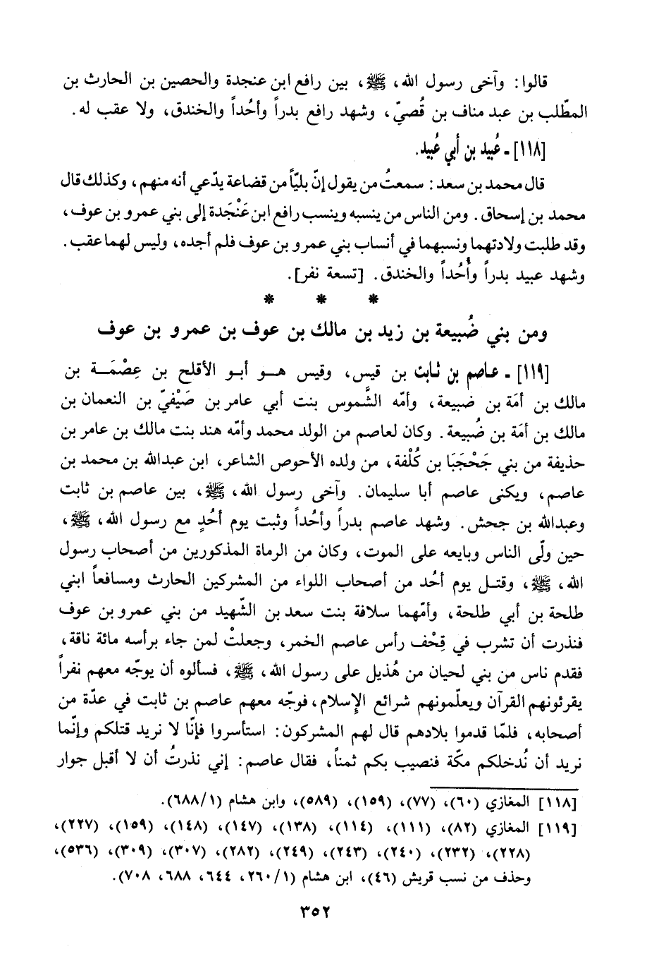 119 المغازي (82) ، (111) ، (114) ، (138) ، (147) ، (148) ، (159) ، (227) ، (228) ، (232) ، (240) ، (243) ، (249) ، (282) ، (307) ، (309) ، (536) ، وحذف من نسب قريش (46) ، ابن هشام (1/ 260، 644، 688، 708) .