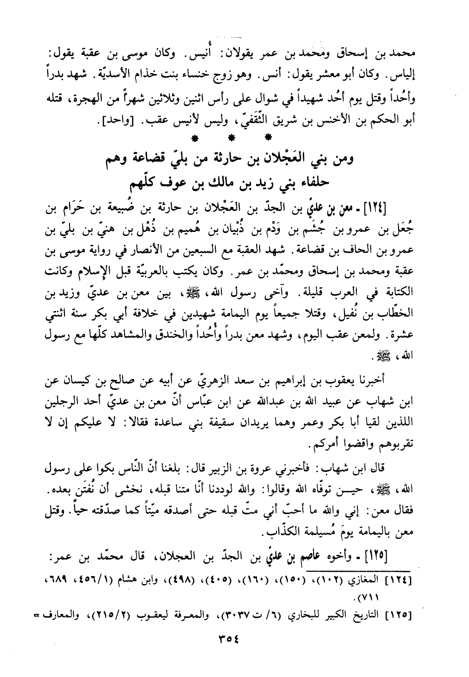 125 التاريخ الكبير للبخاري (6/ ت 3037) ، والمعرفة ليعقوب (2/ 215) ، والمعارف (226) ، والجرح والتعديل (6/ ت 1911) ، والثقات لابن حبان (3/ 286) ، والاستيعاب (2/ 781) ، وأسد الغابة (3/ 75) ، وتجريد أسماء الصحابة (1/ ت 2976) ، والعبر (1/ 53) ، وتذهيب التهذيب (2/ 111) ، وتهذيب الكمال (3015) ، وتهذيب التهذيب (5/ 49) ، والإصابة (2/ ت 4353) ، وتقريب التهذيب (1/ 384) ، وخلاصة الخزرجي (2/ ت 3235) ، وشذرات الذهب (1/ 54) ، والمغازي (101) ، (114) ، (160) ، (685) ، (689) ، (717) ، (719) ، (991) ، (1046) ، (1047) ، (1048) .
