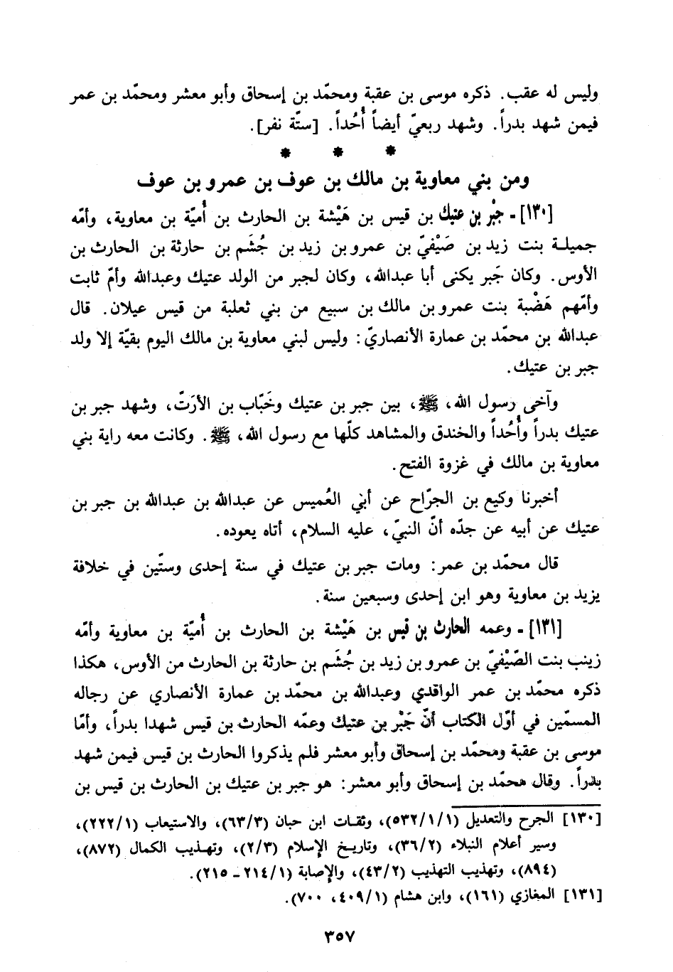 130 الجرح والتعديل (1/ 1/ 532) ، وثقات ابن حبان (3/ 63) ، والاستيعاب (1/ 222) ، وسير أعلام النبلاء (2/ 36) ، وتاريخ الإسلام (3/ 2) ، وتهذيب الكمال (872) ، (894) ، وتهذيب التهذيب (2/ 43) ، والإصابة (1/ 214- 215) .