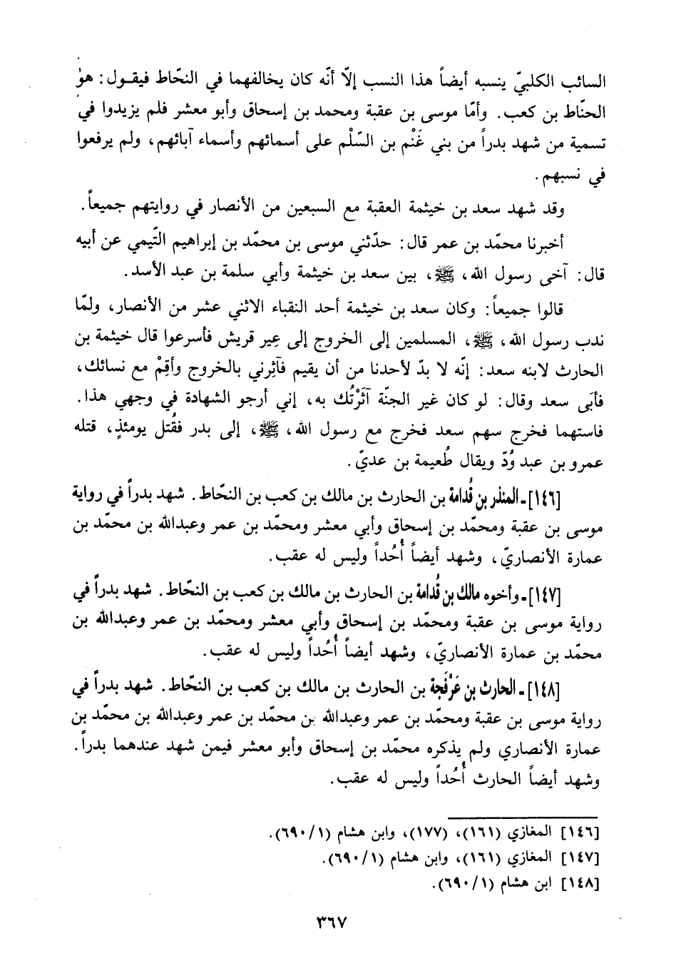 السائب الكلبي ينسبه أيضًا هَذَا النسب إلّا أنّه كان يخالفهما فِي النحاط فيقول: هُوَ الحناط بْن كعب. وأما مُوسَى بْن عُقْبَة ومحمد بْن إِسْحَاق وأبو معشر فلم يزيدوا فِي تسمية من شهِدَ بدْرًا من بني غنم بن السلم على أسمائهم وأسماء آبائهم. ولم يرفعوا فِي نسبهم.