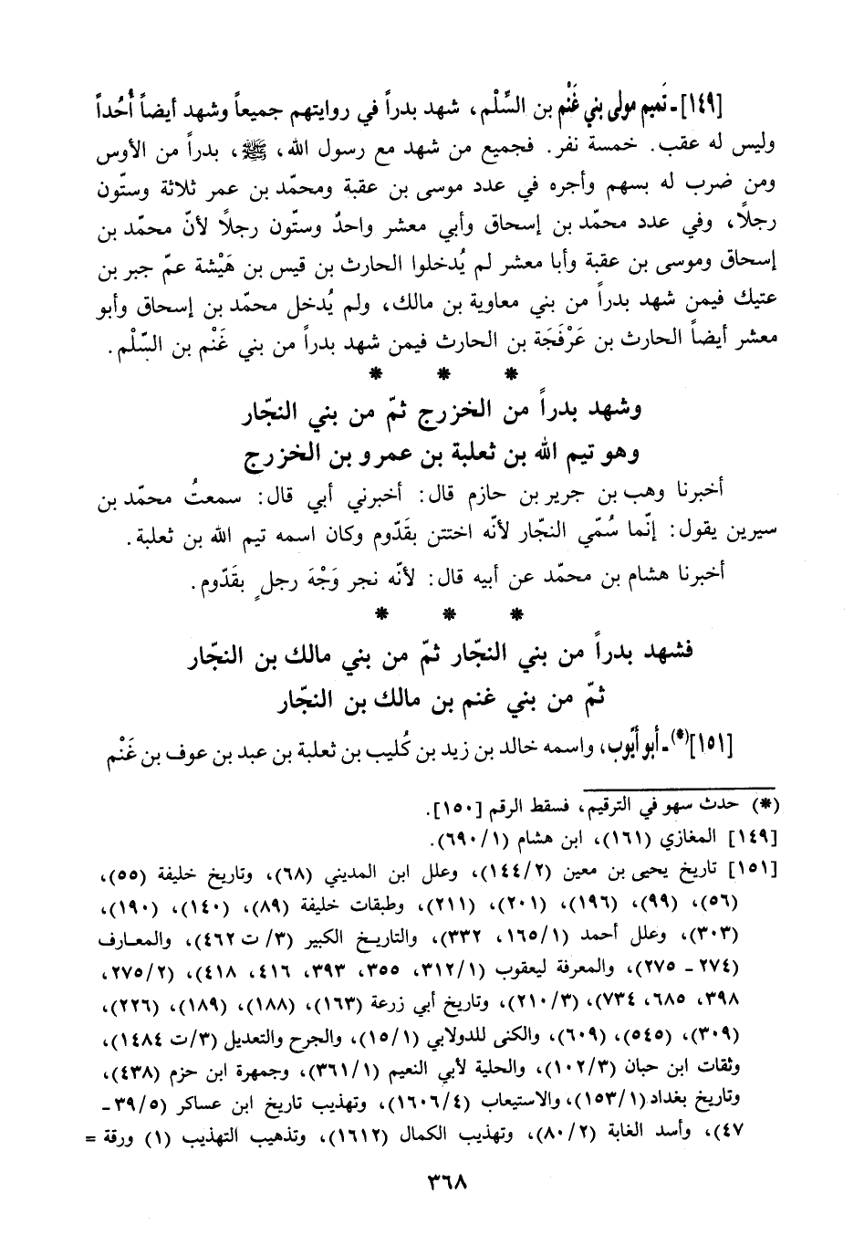 151 تاريخ يحيى بن معين (2/ 144) ، وعلل ابن المديني (68) ، وتاريخ خليفة (55) ، (56) ، (99) ، (196) ، (201) ، (211) ، وطبقات خليفة (89) ، (140) ، (190) ، (303) ، وعلل أحمد (1/ 165، 232) ، والتاريخ الكبير (3/ ت 462) ، والمعارف (274- 275) ، والمعرفة ليعقوب (1/ 312، 355، 393، 416، 418) ، (2/ 275، 398، 685، 734) ، (3/ 210) ، وتاريخ أبي زرعة (163) ، (188) ، (189) ، (226) ، (309) ، (545) ، (609) ، والكنى للدولابي (1/ 15) ، والجرح والتعديل (3/ ت 1484) ، وثقات ابن حبان (3/ 102) ، والحلية لأبي النعيم (1/ 361) ، وجمهرة ابن حزم (438) ، وتاريخ بغداد (1/ 153) ، والاستيعاب (4/ 1606) ، وتهذيب تاريخ ابن عساكر (5/ 39- 47) ، وأسد الغابة (2/ 80) ، وتهذيب الكمال (1612) ، وتذهيب التهذيب (1) ورقة (187) ، وسير أعلام النبلاء (2/ 402- 413) ، وتاريخ الإسلام (2/ 327) ، والعبر (1/ 56) ، وتجريد أسماء الصحابة (1/ 150) ، والإصابة (1/ 405) ، وتهذيب التهذيب (3/ 90- 91) ، وخلاصة الخزرجي (1/ ت 1760) .