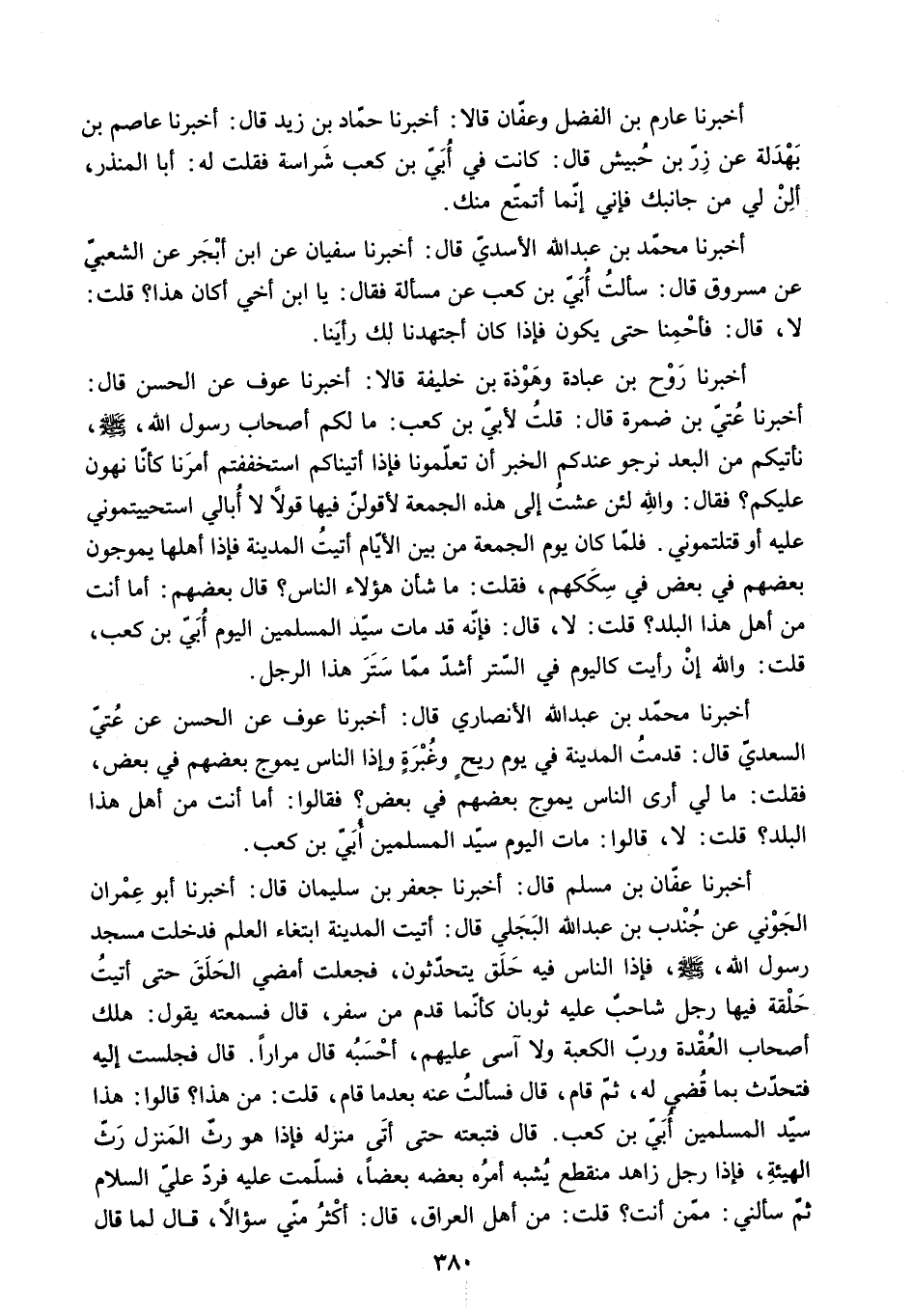أَخْبَرَنَا عَفَّانُ بْنُ مُسْلِمٍ قَالَ: أَخْبَرَنَا جَعْفَرُ بْنُ سُلَيْمَانَ قَالَ: أَخْبَرَنَا أَبُو عِمْرَانَ الْجَوْنِيُّ عَنْ جُنْدُبِ بْنِ عَبْدِ اللَّهِ الْبَجَلِيِّ قَالَ: أَتَيْتُ الْمَدِينَةَ ابْتِغَاءَ الْعِلْمِ فَدَخَلْتُ مَسْجِدِ رَسُولِ اللَّهِ - صَلَّى اللَّهُ عَلَيْهِ وَسَلَّمَ - فَإِذَا النَّاسُ فِيهِ حَلَقٌ يَتَحَدَّثُونَ. فَجَعَلْتُ أَمْضِي الْحَلَقَ حَتَّى أَتَيْتُ حَلْقَةً فِيهَا رَجُلٌ شَاحِبٌ عَلَيْهِ ثَوْبَانِ كَأَنَّمَا قَدِمَ مِنْ سَفَرٍ. قَالَ فَسَمِعْتُهُ يَقُولُ: هَلَكَ أَصْحَابُ الْعُقْدَةِ وَرَبِّ الْكَعْبَةِ وَلا آسَى عَلَيْهِمْ. أَحْسِبُهُ قَالَ مِرَارًا. قَالَ فَجَلَسْتُ إِلَيْهِ فَتَحَدَّثَ بِمَا قُضِيَ لَهُ. ثُمَّ قام. قال فسألت عنه بعد ما قَامَ. قُلْتُ: مَنْ هَذَا؟ قَالُوا: هَذَا سَيِّدُ الْمُسْلِمِينَ أُبَيُّ بْنُ كَعْبٍ. قَالَ فَتَبِعْتُهُ حَتَّى أَتَى مَنْزِلَهُ فَإِذَا هُوَ رَثُّ الْمَنْزِلِ رَثُّ الْهَيْئَةِ. فَإِذَا رَجُلٌ زَاهِدٌ مُنْقَطِعٌ يُشْبِهُ أَمْرُهُ بَعْضُهُ بَعْضًا. فَسَلَّمْتُ عَلَيْهِ فَرَدَّ عَلَيَّ السَّلامَ ثُمَّ سَأَلَنِي: مِمَّنْ أَنْتَ؟ قُلْتُ: مِنْ أَهْلِ الْعِرَاقِ. قَالَ: أَكْثَرُ مِنِّي سُؤَالا. قَالَ لَمَّا قال