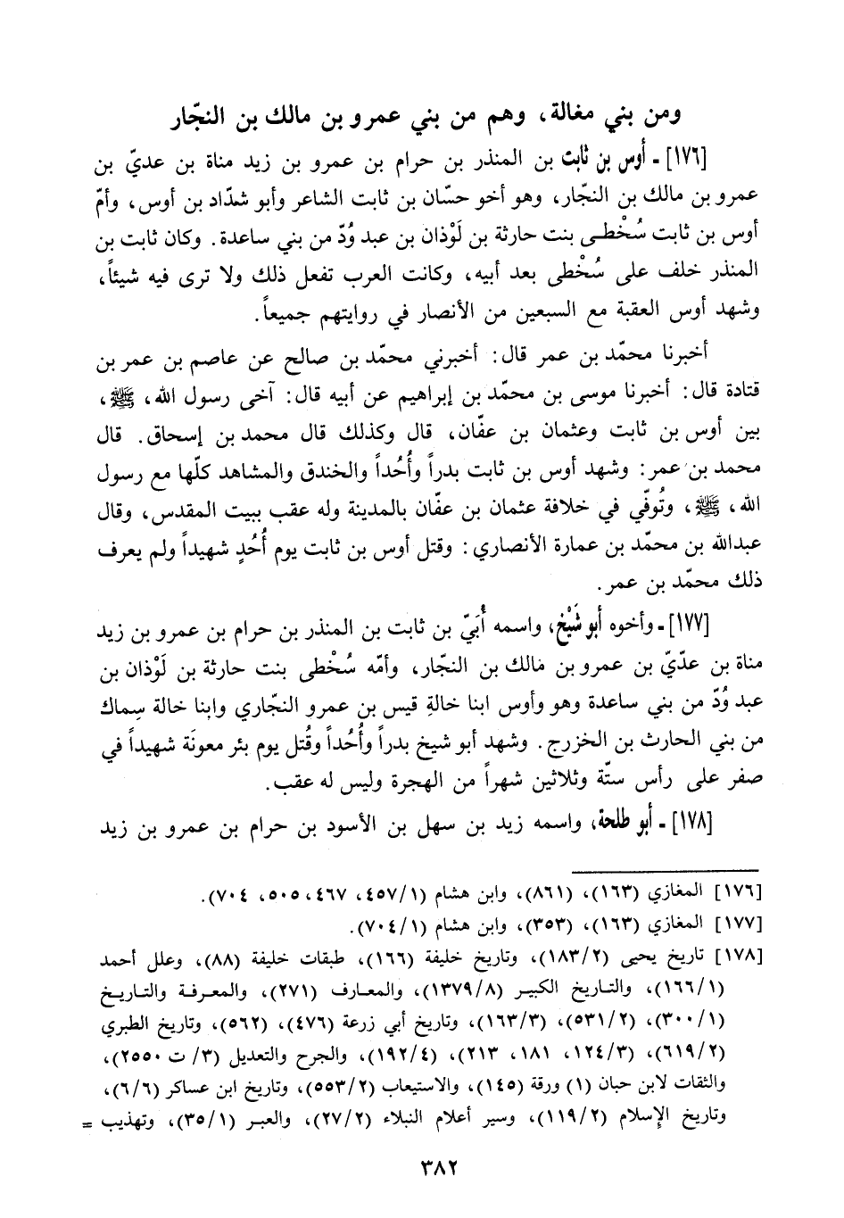 178 تاريخ يحيى (2/ 183) ، وتاريخ خليفة (166) ، طبقات خليفة (88) ، وعلل أحمد (1/ 166) ، والتاريخ الكبير (8/ 1379) ، والمعارف (271) ، والمعرفة والتاريخ (1/ 300) ، (2/ 531) ، (3/ 163) ، (4/ 192) ، والجرح والتعديل (3/ ت 2550) ، والثقات لابن حبان (1) ورقة (145) ، والاستيعاب (2/ 553) ، وتاريخ ابن عساكر (6/ 6) ، وتاريخ الإسلام (2/ 119) ، وسير أعلام النبلاء (2/ 27) ، والعبر (1/ 35) ، وتهذيب الكمال (2110) ، وتذهيب التهذيب (1) ورقة (253) ، وتهذيب التهذيب (3/ 414) ، والإصابة (1/ 566) ، وخلاصة الخزرجي (1/ ت 2261) ، وشذرات الذهب (1/ 40) وابن هشام (1/ 457، 700) .