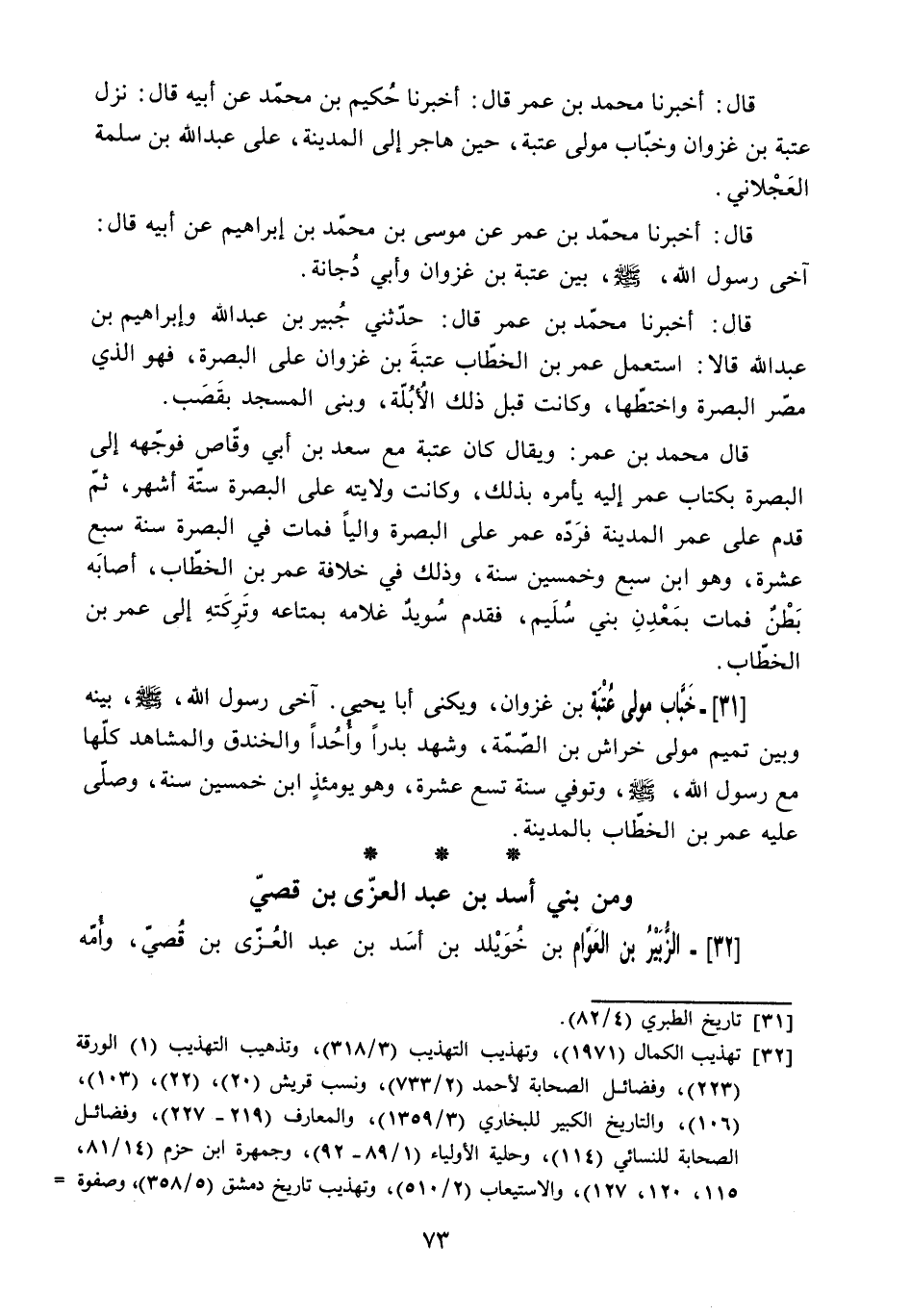 32 تهذيب الكمال (1971) ، وتهذيب التهذيب (3/ 318) ، وتذهيب التهذيب (1) الورقة (223) ، وفضائل الصحابة لأحمد (2/ 733) ، ونسب قريش (20) ، (22) ، (103) ، (106) ، وتاريخ الكبير للبخاري (3/ 1359) ، والمعارف (219- 227) ، وفضائل الصحابة للنسائي (114) ، وحلية الأولياء (1/ 89- 92) ، وجمهرة ابن حزم (14/ 81، 115، 120، 127) ، والاستيعاب (2/ 510) ، وتهذيب تاريخ دمشق (5/ 358) ، وصفوة الصفوة (1/ 132) ، وتهذيب الأسماء واللغات (1/ 194- 196) ، وسير أعلام النبلاء (1/ 41) ، والعبر (1/ 37) ، وتجريد أسماء الصحابة (1/ 188) ، والعقد الثمين (4/ 429) ، والإصابة (1/ 545) ، وحذف من نسب قريش (52) .