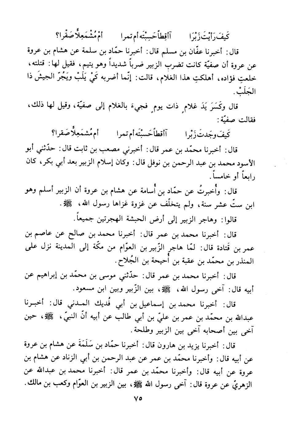 قَالَ: أَخْبَرَنَا عَفَّانُ بْنُ مُسْلِمٍ قَالَ: أَخْبَرَنَا حَمَّادُ بْنُ سَلَمَةَ عَنْ هِشَامِ بْنِ عُرْوَةَ عَنْ عُرْوَةَ أَنَّ صَفِيَّةَ كَانَتْ تَضْرِبُ الزُّبَيْرَ ضَرْبًا شَدِيدًا وَهُوَ يَتِيمٌ. فَقِيلَ لَهَا: قَتَلْتِهِ.