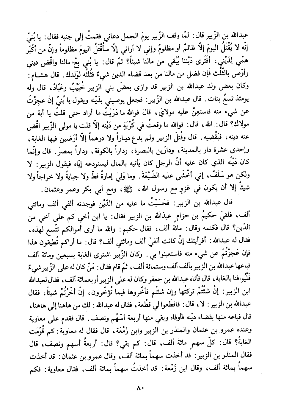 عَبْدِ اللَّهِ بْنِ الزُّبَيْرِ قَالَ: لَمَّا وَقَفَ الزُّبَيْرُ يَوْمَ الْجَمَلِ دَعَانِي فَقُمْتُ إِلَى جَنْبِهِ فَقَالَ: يَا بُنَيَّ إِنَّهُ لا يُقْتَلُ الْيَوْمَ إِلا ظَالِمٌ أَوْ مَظْلُومٌ وَإِنِّي لا أُرَانِي إِلا سَأُقْتَلُ الْيَوْمَ مَظْلُومًا وَإِنَّ مِنْ أَكْبَرِ هَمِّي لَدَيْنِي. أَفَتَرَى دَيْنَنَا يُبْقِي مِنْ مَالِنَا شَيْئًا؟ ثُمَّ قَالَ: يَا بُنَيَّ بِعْ مَالَنَا وَاقْضِ دَيْنِي وَأَوْصِ بِالثُّلُثِ فَإِنْ فَضُلَ مِنْ مَالِنَا مِنْ بَعْدَ قَضَاءِ الدَّيْنِ شَيْءٌ فَثُلُثُهُ لِوَلَدِكَ. قَالَ هِشَامٌ: