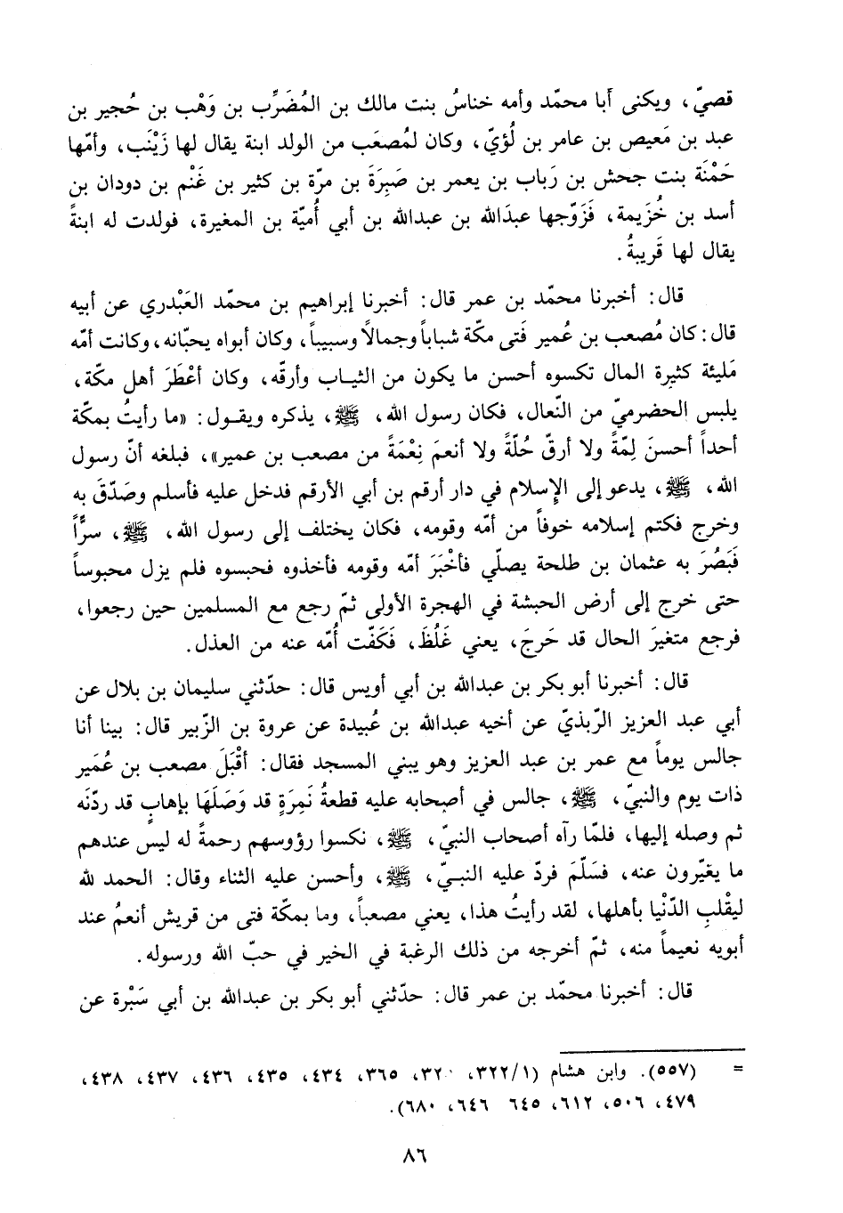 قَالَ: أَخْبَرَنَا مُحَمَّدُ بْنُ عُمَرَ قَالَ: أَخْبَرَنَا إِبْرَاهِيمُ بْنُ مُحَمَّدٍ الْعَبْدَرِيُّ عَنْ أَبِيهِ قَالَ: كَانَ مُصْعَبُ بْنُ عُمَيْرٍ فَتَى مَكَّةَ شَبَابًا وَجَمَالا وَسَبِيبًا. وَكَانَ أَبَوَاهُ يُحِبَّانِهِ. وَكَانَتْ أُمُّهُ مَلِيئَةً كَثِيرَةَ الْمَالِ تَكْسُوهُ أَحْسَنَ مَا يَكُونُ مِنَ الثِّيَابِ وَأَرَقَّهُ. وَكَانَ أَعْطَرَ أَهْلِ مَكَّةَ.