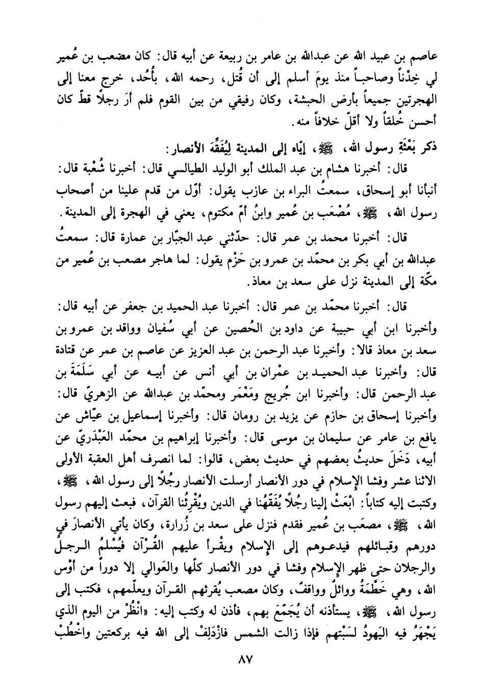 قَالَ: أَخْبَرَنَا مُحَمَّدُ بْنُ عُمَرَ قَالَ: حَدَّثَنِي عَبْدُ الْجَبَّارِ بْنُ عُمَارَةَ قَالَ: سَمِعْتُ عَبْدَ اللَّهِ بْنَ أَبِي بَكْرِ بْنِ مُحَمَّدِ بْنِ عَمْرِو بْنِ حَزْمٍ يَقُولُ: لَمَّا هَاجَرَ مُصْعَبُ بْنُ عُمَيْرٍ مِنْ مَكَّةَ إِلَى الْمَدِينَةِ نَزَلَ عَلَى سَعْدِ بن معاذ.