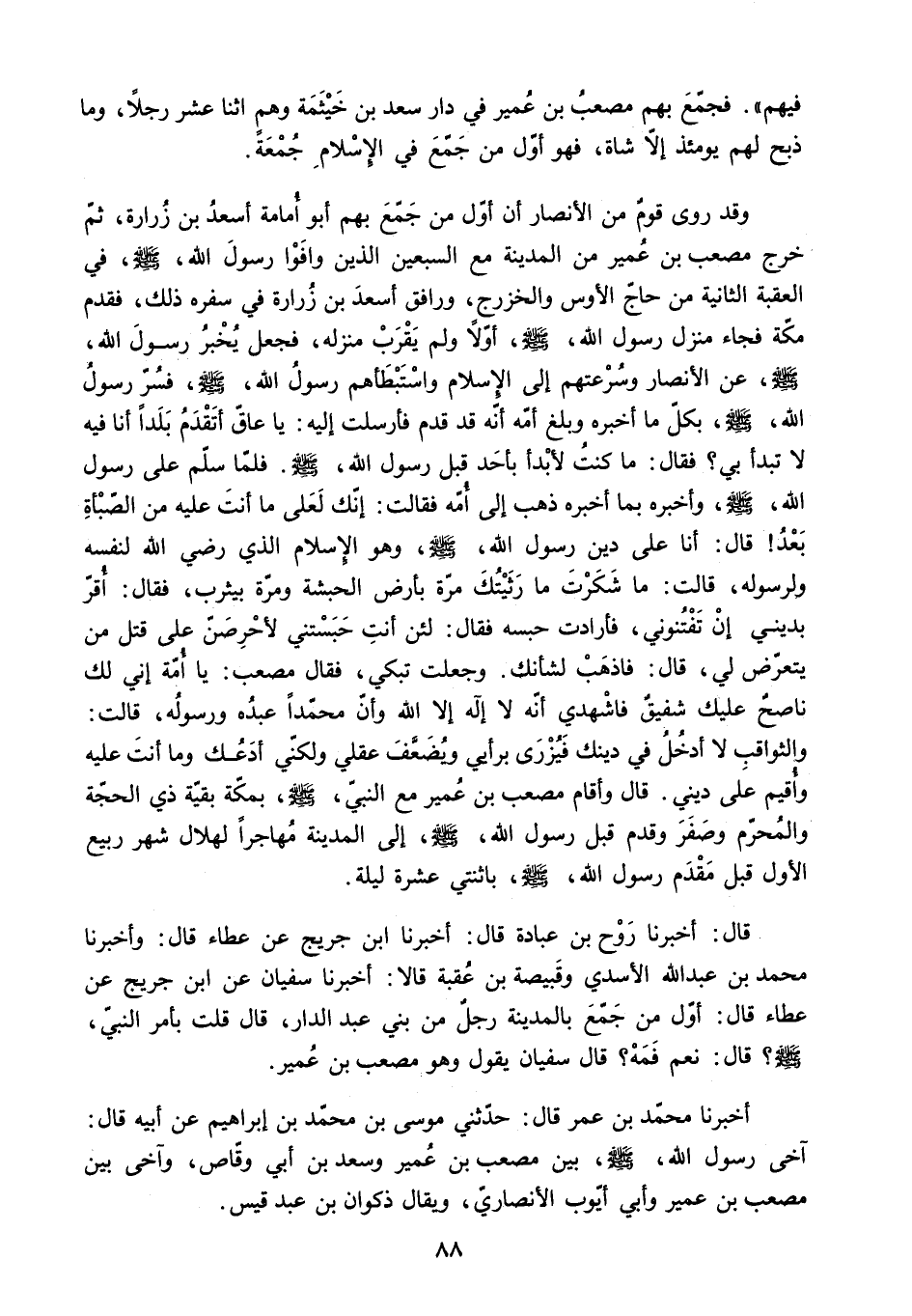 ص. عَنِ الأَنْصَارِ وَسُرْعَتِهِمْ إِلَى الإِسْلامِ وَاسْتِبْطَأَهُمْ رَسُولَ اللَّهِ - صَلَّى اللَّهُ عَلَيْهِ وَسَلَّمَ - فَسُرَّ رَسُولُ اللَّهِ - صَلَّى اللَّهُ عَلَيْهِ وَسَلَّمَ - بِكُلِّ مَا أَخْبَرَهُ وَبَلَغَ أُمَّهُ أَنَّهُ قَدْ قَدِمَ فَأَرْسَلَتْ إِلَيْهِ: يَا عَاقُّ أَتَقْدَمُ بَلَدًا أَنَا فِيهِ لا تَبْدَأُ بِي؟ فَقَالَ: مَا كُنْتُ لأَبْدَأَ بِأَحَدٍ قَبْلَ رَسُولِ اللَّهِ - صَلَّى اللَّهُ عَلَيْهِ وَسَلَّمَ - فَلَمَّا سَلَّمَ عَلَى رَسُولِ اللَّهِ - صَلَّى اللَّهُ عَلَيْهِ وَسَلَّمَ - وَأَخْبَرَهُ بِمَا أَخْبَرَهُ ذَهَبَ إِلَى أُمِّهِ فَقَالَتْ: إِنَّكَ لَعَلَى مَا أَنْتَ عَلَيْهِ مِنَ الصَّبْأَةِ بَعْدُ! قَالَ: أَنَا عَلَى دَيْنَ رَسُولِ اللَّهِ - صَلَّى اللَّهُ عَلَيْهِ وَسَلَّمَ - وَهُوَ الإِسْلامُ الَّذِي رَضِيَ اللَّهُ لِنَفْسِهِ وَلِرَسُولِهِ. قَالَتْ: مَا شَكَرْتَ مَا رَثَيْتُكَ مَرَّةً بِأَرْضِ الْحَبَشَةِ وَمَرَّةً بِيَثْرِبَ. فَقَالَ: أُقِرُّ بِدِينِي إِنْ تَفْتُنُونِي. فَأَرَادَتْ حَبْسَهُ فَقَالَ: لَئِنْ أَنْتِ حَبَسْتَنِي لأحرصن على قتل من يتعرض لي. قال: فَاذْهَبْ لِشَأْنَكَ. وَجَعَلَتْ تَبْكِي. فَقَالَ مُصْعَبٌ: يَا أُمَّةُ إِنِّي لَكِ نَاصِحٌ عَلَيْكِ شَفِيقٌ فَاشْهَدِي أَنَّهُ لا إِلَهَ إِلا اللَّهُ وَأَنَّ مُحَمَّدًا عَبْدُهُ وَرَسُولُهُ. قَالَتْ: