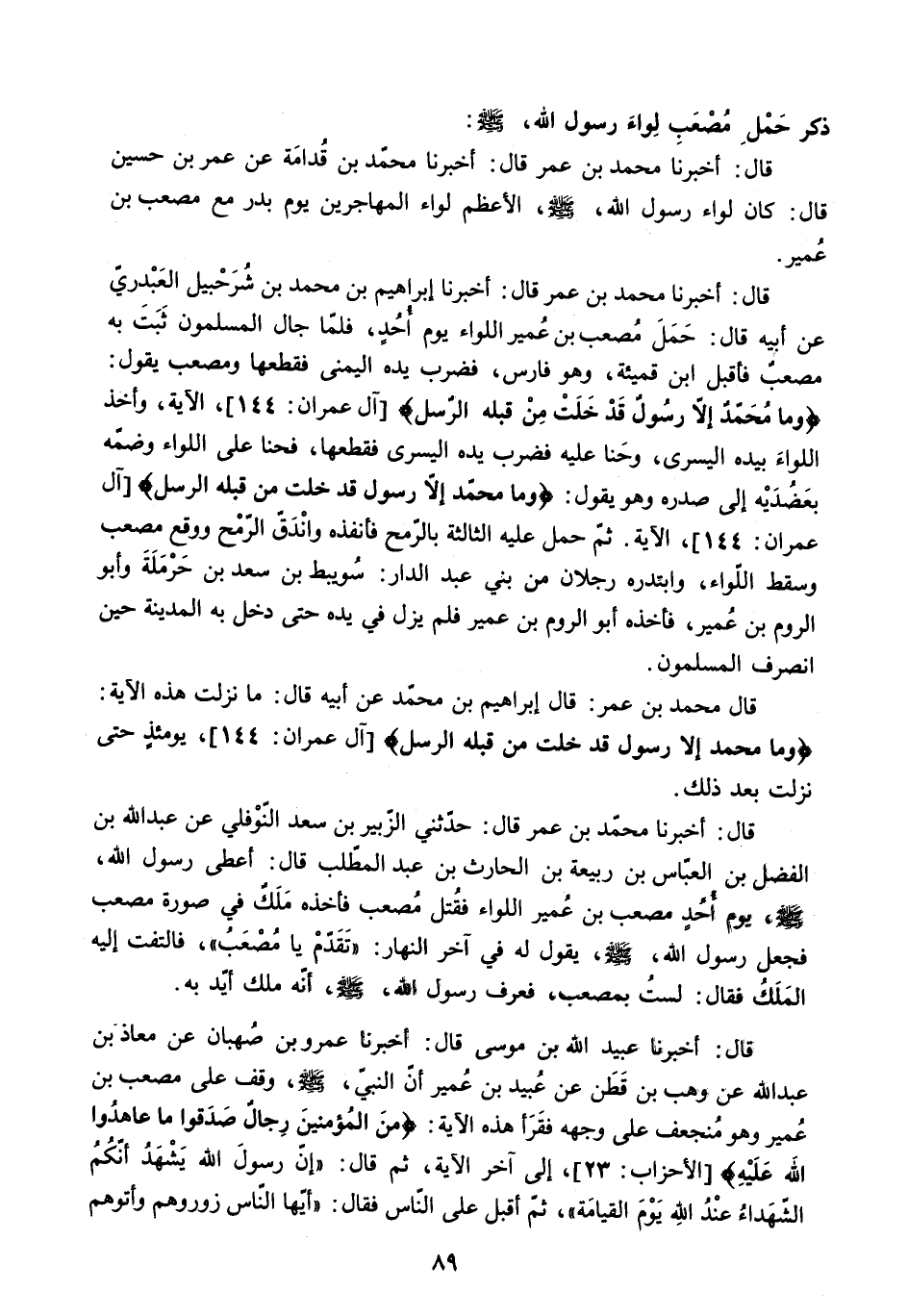 قَالَ: أَخْبَرَنَا مُحَمَّدُ بْنُ عُمَرَ قَالَ: أَخْبَرَنَا إِبْرَاهِيمُ بْنُ مُحَمَّدِ بْنِ شُرَحْبِيلَ الْعَبْدَرِيُّ عَنْ أَبِيهِ قَالَ: حَمَلَ مُصْعَبُ بْنُ عُمَيْرٍ اللِّوَاءَ يَوْمَ أُحُدٍ. فَلَمَّا جَالَ الْمُسْلِمُونَ ثَبَتَ بِهِ مُصْعَبٌ فَأَقْبَلَ ابْنُ قَمِيئَةَ. وَهُوَ فَارِسٌ. فَضَرَبَ يَدَهُ الْيُمْنَى فَقَطَعَهَا وَمُصْعَبٌ يَقُولُ: