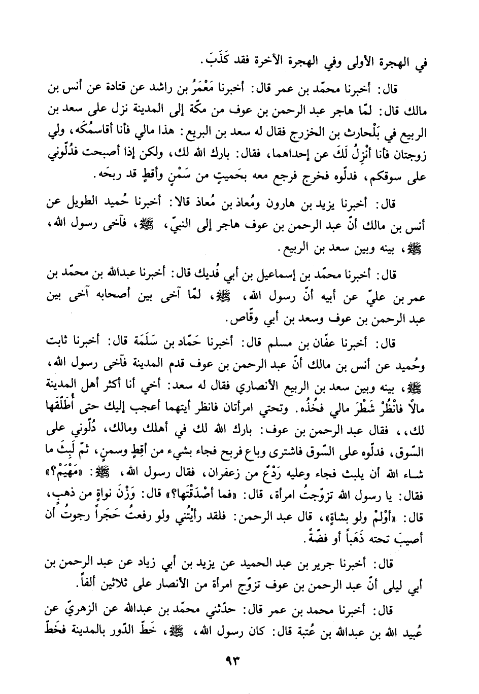قَالَ: أَخْبَرَنَا مُحَمَّدُ بْنُ عُمَرَ قَالَ: أَخْبَرَنَا مَعْمَرُ بْنُ رَاشِدٍ عَنْ قَتَادَةَ عَنْ أَنَسِ بْنِ مَالِكٍ قَالَ: لَمَّا هَاجَرَ عَبْدُ الرَّحْمَنِ بْنُ عَوْفٍ مِنْ مَكَّةَ إِلَى الْمَدِينَةِ نَزَلَ عَلَى سَعْدِ بْنِ الرَّبِيعِ فِي بَلْحَارِثِ بْنِ الْخَزْرَجِ فَقَالَ لَهُ سَعْدُ بن البريع: هَذَا مَالِي فَأَنَا أُقَاسِمُكَهُ. وَلِيَ زَوْجَتَانِ فَأَنَا أَنْزِلُ لَكَ عَنْ إِحْدَاهُمَا. فَقَالَ: بَارَكَ اللَّهُ لَكَ. وَلَكِنْ إِذَا أَصْبَحْتُ فَدُلُّونِي عَلَى سُوقِكُمْ. فَدَلُّوهُ فَخَرَجَ فَرَجَعَ مَعَهُ بِحَمِيتٍ مِنْ سَمْنٍ وَأَقِطٍ قَدْ رَبِحَهُ.
