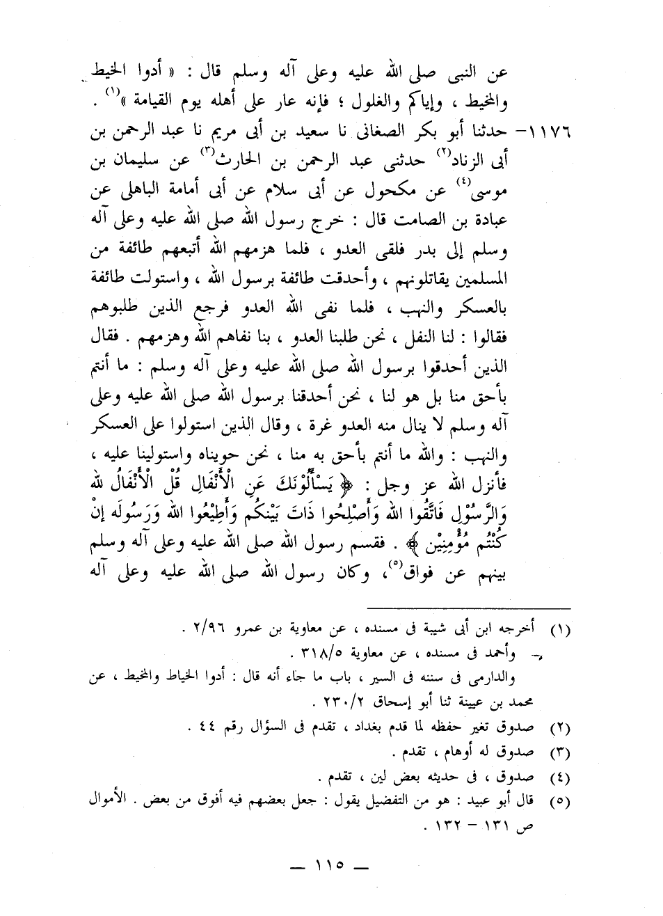 1176 - حَدَّثَنَا أَبُو بَكْرٍ الصَّغَانِيُّ، نا سَعِيدُ بْنُ أَبِي مَرْيَمَ، نا عَبْدُ الرَّحْمَنِ بْنُ أَبِي الزِّنَادِ، حَدَّثَنِي عَبْدُ الرَّحْمَنِ بْنُ الْحَارِثِ، عَنْ سُلَيْمَانَ بْنِ مُوسَى، عَنْ مَكْحُولٍ، عَنْ أَبِي سَلَّامٍ، عَنْ أَبِي أُمَامَةَ الْبَاهِلِيِّ، عَنْ عُبَادَةَ بْنِ الصَّامِتِ، قَالَ: خَرَجَ رَسُولُ اللَّهِ صَلَّى اللَّهُ عَلَيْهِ وَعَلَى آلِهِ وَسَلَّمَ إِلَى بَدْرٍ فَلَقِيَ الْعَدُوَّ , فَلَمَّا هَزَمَهُمُ اللَّهُ أَتْبَعَهُمْ طَائِفَةٌ مِنَ الْمُسْلِمِينَ يُقَاتِلُونَهُمْ، وَأَحْدَقتْ طَائِفَةٌ بِرَسُولِ اللَّهِ , وَاسْتَوْلَتْ طَائِفَةٌ بِالْعَسْكَرِ وَالنَّهْبِ، فَلَمَّا نَفَى اللَّهُ الْعَدُوَّ فَرَجَعَ الَّذِينَ طَلَبُوهُمْ فَقَالُوا: لَنَا النَّفَلُ، نَحْنُ طَلَبْنَا الْعَدُوَّ، بِنَا نَفَاهُمُ اللَّهُ وَهَزَمَهُمْ، فَقَالَ الَّذِينَ أَحْدَقُوا بِرَسُولِ اللَّهِ صَلَّى اللَّهُ عَلَيْهِ وَعَلَى آلِهِ وَسَلَّمَ: مَا أَنْتُمْ بِأَحَقَّ مِنَّا , بَلْ هُوَ لَنَا نَحْنُ أَحْدَقْنَا بِرَسُولِ اللَّهِ صَلَّى اللَّهُ عَلَيْهِ وَعَلَى آلِهِ وَسَلَّمَ لَا يَنَالُ مِنْهُ الْعَدُوُّ غِرَّةً، وَقَالَ الَّذِينَ اسْتَوْلَوْا عَلَى الْعَسْكَرِ وَالنَّهْبِ: وَاللَّهِ مَا أَنْتُمْ بِأَحَقَّ بِهِ مِنَّا، نَحْنُ حَوَيْنَاهُ وَاسْتَوْلَيْنَا عَلَيْهِ، فَأَنْزَلَ اللَّهُ عَزَّ وَجَلَّ: {§يَسْأَلُونَكَ عَنِ الْأَنْفَالِ قُلِ الْأَنْفَالُ لِلَّهِ وَالرَّسُولِ فَاتَّقُوا اللَّهَ وَأَصْلِحُوا ذَاتَ بَيْنِكُمْ وَأَطِيعُوا اللَّهَ وَرَسُولَهُ إِنْ كُنْتُمْ مُؤْمِنِينَ} [الأنفال: 1] فَقَسَّمَ رَسُولُ اللَّهِ صَلَّى اللَّهُ عَلَيْهِ وَعَلَى آلِهِ وَسَلَّمَ بَيْنَهُمْ عَنْ فَوَاقٍ