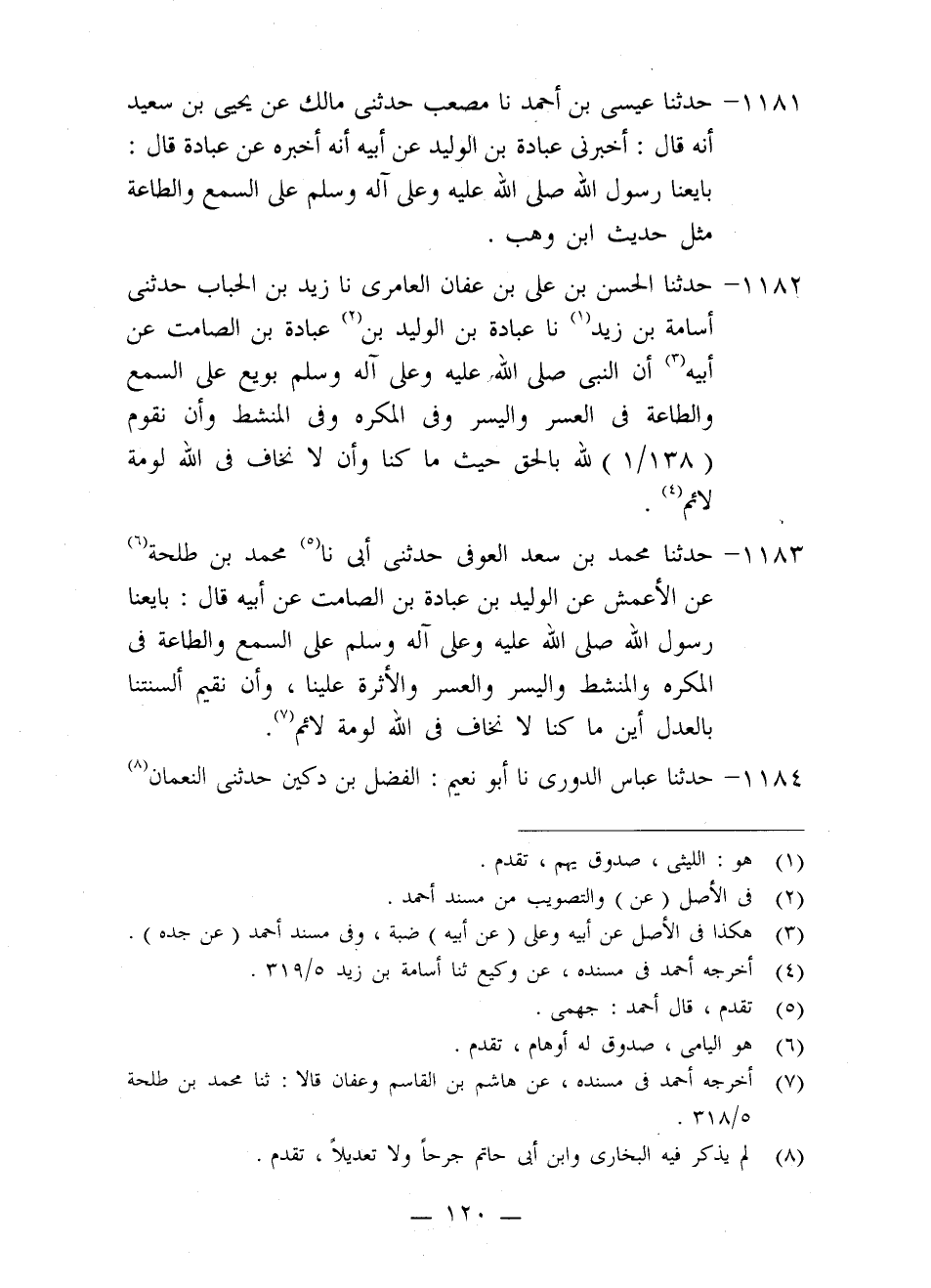 1182 - حَدَّثَنَا الْحَسَنُ بْنُ عَلِيِّ بْنِ عَفَّانَ الْعَامِرِيُّ، نا زَيْدُ بْنُ الْحُبَابِ، حَدَّثَنِي أُسَامَةُ بْنُ زَيْدٍ، نا عُبَادَةُ بْنُ الْوَلِيدِ بْنِ عُبَادَةَ بْنِ الصَّامِتِ، عَنْ أَبِيهِ، أَنَّ النَّبِيَّ صَلَّى اللَّهُ عَلَيْهِ وَعَلَى آلِهِ وَسَلَّمَ بُويِعَ عَلَى §السَّمْعِ وَالطَّاعَةِ فِي الْعُسْرِ وَالْيُسْرِ , وَفِي الْمَكْرَهِ وَفِي الْمَنْشَطِ , وَأَنْ نَقُومَ لِلَّهِ بِالْحَقِّ حَيْثُ مَا كُنَّا , وَأَنْ لَا نَخَافَ فِي اللَّهِ لَوْمَةَ لَائِمٍ