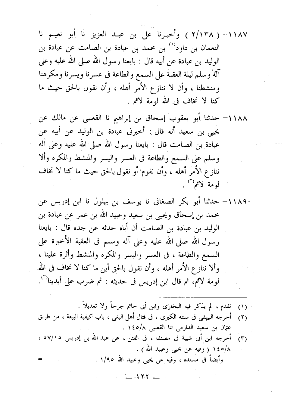 1189 - حَدَّثَنَا أَبُو بَكْرٍ الصَّغَانِيُّ، نا يُوسُفُ بْنُ بُهْلُولٍ، نا ابْنُ إِدْرِيسَ، عَنْ مُحَمَّدِ بْنِ إِسْحَاقَ، وَيَحْيَى بْنِ سَعِيدٍ , وَعُبَيْدِ اللَّهِ بْنِ عُمَرَ , عَنْ عُبَادَةَ بْنِ الْوَلِيدِ بْنِ عُبَادَةِ بْنِ الصَّامِتِ، أَنَّ أَبَاهُ، حَدَّثَهُ، عَنْ جَدِّهِ، قَالَ: §بَايَعْنَا رَسُولَ اللَّهِ صَلَّى اللَّهُ عَلَيْهِ وَعَلَى آلِهِ وَسَلَّمَ فِي الْعَقَبَةِ الْأَخِيرَةِ عَلَى السَّمْعِ وَالطَّاعَةِ، فِي الْعُسْرِ وَالْيُسْرِ وَالْمَكْرَهِ وَالْمَنْشَطِ وَأَثَرَةٍ عَلَيْنَا، وَأَلَّا نُنَازِعَ الْأَمْرَ أَهْلَهُ، وَأَنْ نَقُولَ بِالْحَقِّ أَيْنَمَا كُنَّا لَا نَخَافُ فِي اللَّهِ لَوْمَةَ لَائِمٍ. ثُمَّ قَالَ ابْنُ إِدْرِيسَ فِي حَدِيثِهِ: ثُمَّ ضَرَبَ عَلَى أَيْدِينَا