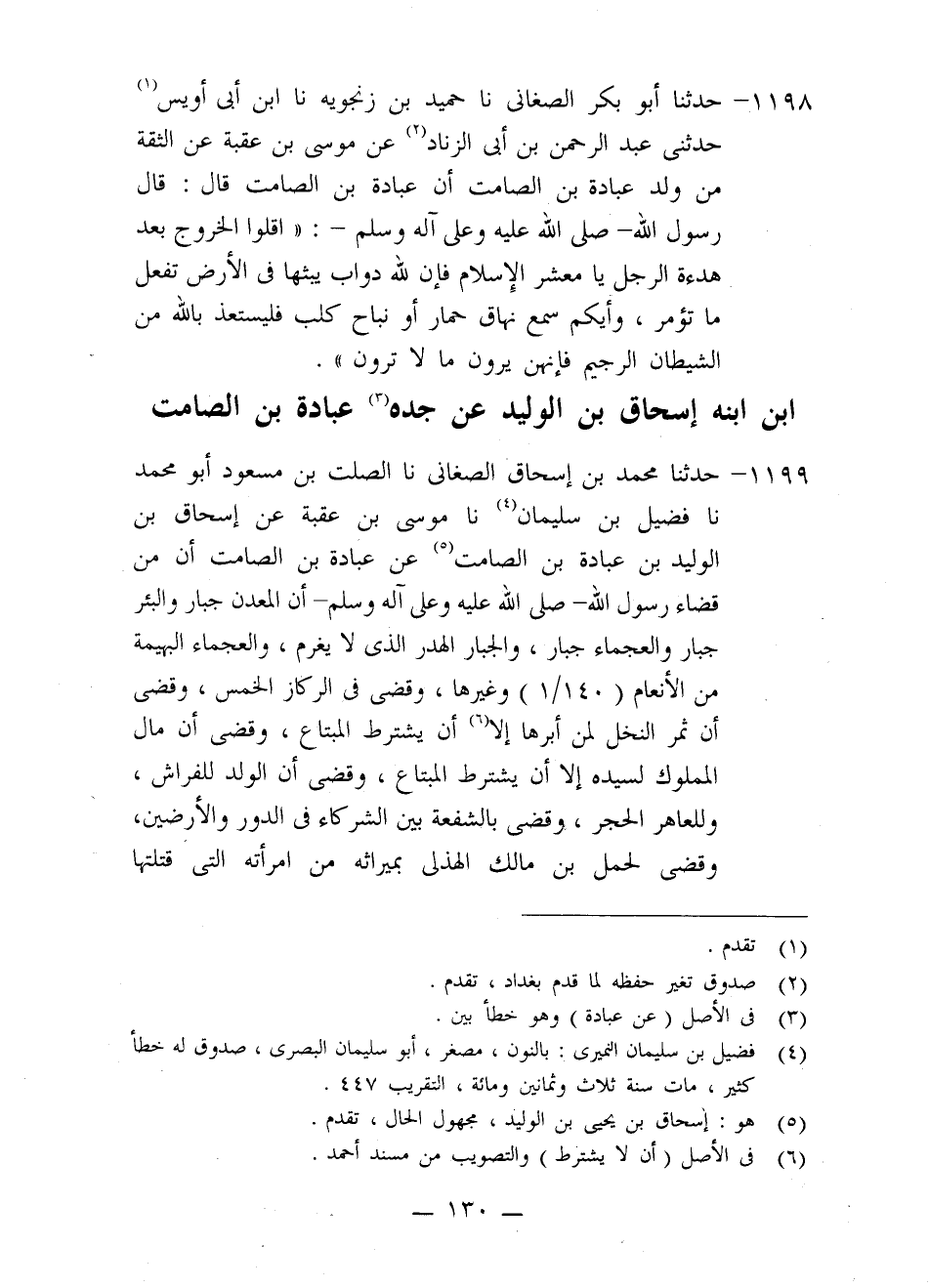 1199 - حَدَّثَنَا مُحَمَّدُ بْنُ إِسْحَاقَ الصَّغَانِيُّ، نا الصَّلْتُ بْنُ مَسْعُودٍ أَبُو مُحَمَّدٍ، نا فُضَيْلُ بْنُ سُلَيْمَانَ، نا مُوسَى بْنُ عُقْبَةَ، عَنْ إِسْحَاقَ بْنِ الْوَلِيدِ بْنِ عُبَادَةَ بْنِ الصَّامِتِ، عَنْ عُبَادَةَ بْنِ الصَّامِتِ، أَنَّ مِنْ قَضَاءِ رَسُولِ اللَّهِ صَلَّى اللَّهُ عَلَيْهِ وَعَلَى آلِهِ وَسَلَّمَ أَنَّ " §الْمَعْدِنَ جُبَارٌ وَالْبِئْرَ جُبَارٌ وَالْعَجْمَاءَ جُبَارٌ، وَالْجُبَارُ: الْهَدَرُ الَّذِي لَا يُغْرَمُ، وَالْعَجْمَاءُ: الْبَهِيمَةُ مِنَ الْأَنْعَامِ وَغَيْرُهَا "