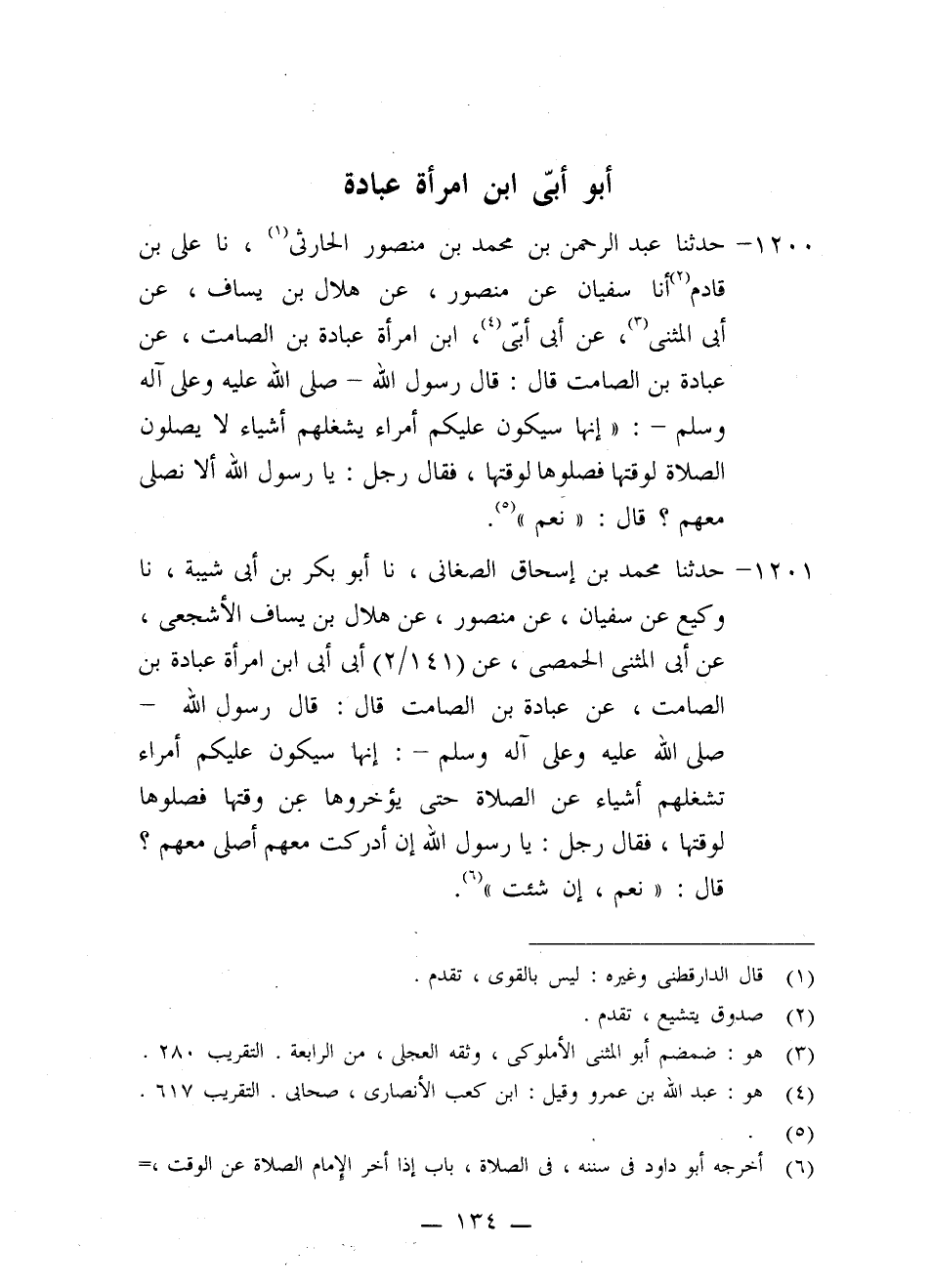 1201 - حَدَّثَنَا مُحَمَّدُ بْنُ إِسْحَاقَ الصَّغَانِيُّ، نا أَبُو بَكْرِ بْنُ أَبِي شَيْبَةَ، نا وَكِيعٌ، عَنْ سُفْيَانَ، عَنْ مَنْصُورٍ، عَنْ هِلَالِ بْنِ يَسَافٍ الْأَشْجَعِيِّ، عَنْ أَبِي الْمُثَنَّى الْحِمْصِيِّ، عَنْ أَبِي أُبَيٍّ ابْنِ امْرَأَةِ عُبَادَةَ بْنِ الصَّامِتِ، عَنْ عُبَادَةَ بْنِ الصَّامِتِ، قَالَ: قَالَ رَسُولُ اللَّهِ صَلَّى اللَّهُ عَلَيْهِ وَعَلَى آلِهِ وَسَلَّمَ: «إِنَّهَا §سَتَكُونُ عَلَيْكُمْ أُمَرَاءُ تَشْغَلُهُمْ أَشْيَاءُ عَنِ الصَّلَاةِ حَتَّى يُؤَخِّرُوهَا عَنْ وَقْتِهَا فَصَلُّوهَا لِوَقْتِهَا» ، فَقَالَ رَجُلٌ: يَا رَسُولَ اللَّهِ، إِنْ أَدْرَكْتُ مَعَهُمْ أُصَلِّي مَعَهُمْ؟ قَالَ: «نَعَمْ، إِنْ شِئْتَ»