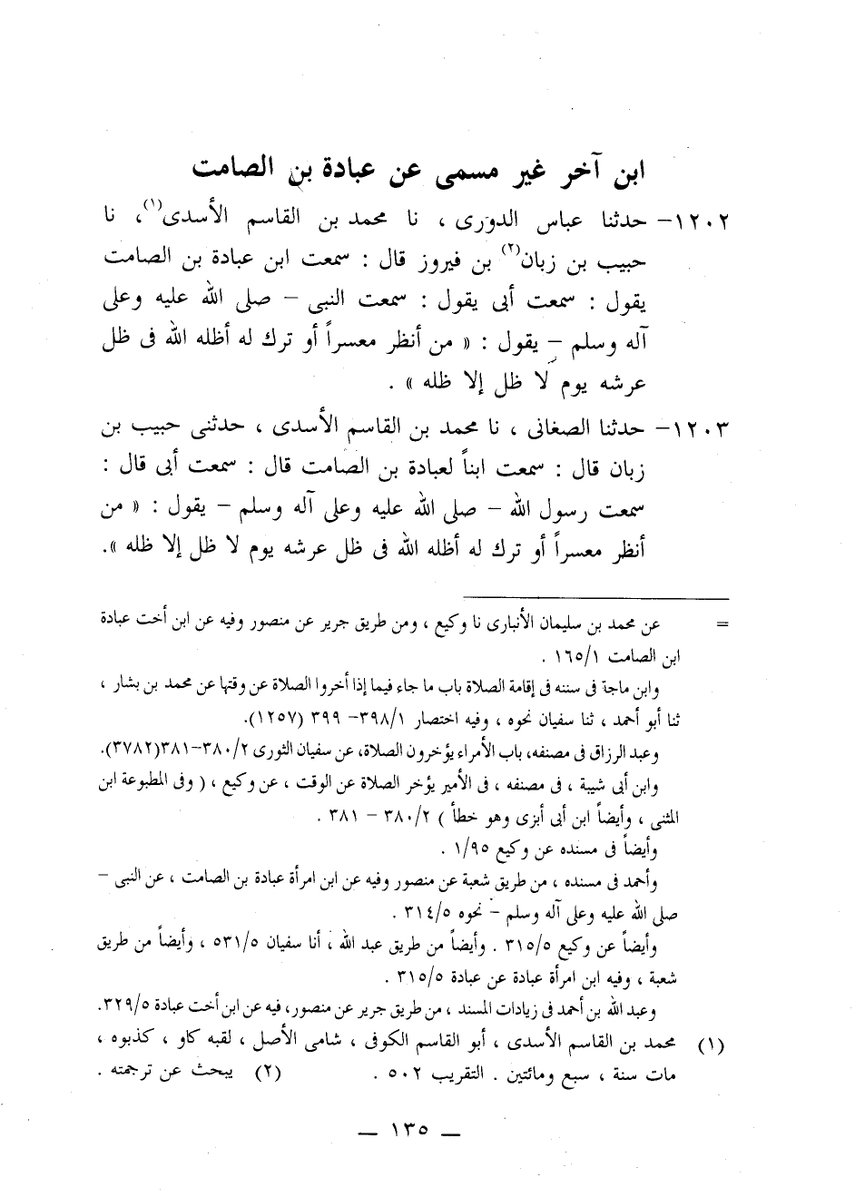 1202 - حَدَّثَنَا عَبَّاسٌ الدُّورِيُّ، نا مُحَمَّدُ بْنُ الْقَاسِمِ الْأَسَدِيُّ، نا حَبِيبُ بْنُ زَبَّانَ بْنِ فَيْرُوزَ، قَالَ: سَمِعْتُ ابْنَ عُبَادَةَ بْنِ الصَّامِتِ، يَقُولُ: سَمِعْتُ أَبِي يَقُولُ سَمِعْتُ النَّبِيَّ صَلَّى اللَّهُ عَلَيْهِ وَعَلَى آلِهِ وَسَلَّمَ يَقُولُ: «§مَنْ أَنْظَرَ مُعْسِرًا أَوْ تَرَكَ لَهُ أَظَلَّهُ اللَّهُ فِي ظِلِّ عَرْشِهِ يَوْمَ لَا ظِلَّ إِلَّا ظِلُّهُ»