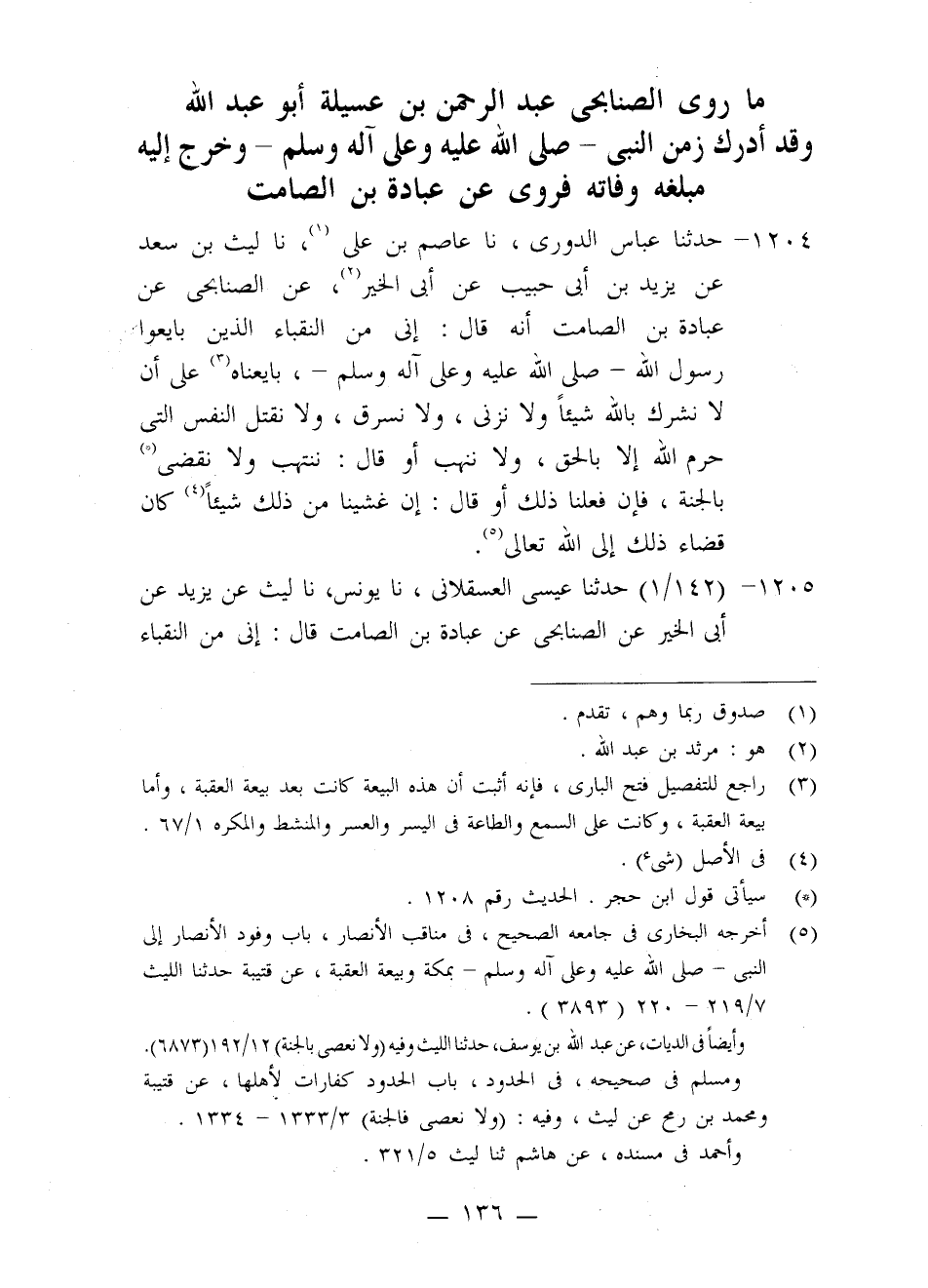 1205 - حَدَّثَنَا عِيسَى الْعَسْقَلَانِيُّ، نا يُونُسُ، نا لَيْثٌ، عَنْ يَزِيدَ، عَنْ أَبِي الْخَيْرِ، عَنِ الصُّنَابِحِيّ، عَنْ عُبَادَةَ بْنِ الصَّامِتِ، قَالَ: إِنِّي مِنَ النُّقَبَاءِ -[137]- الَّذِينَ بَايَعُوا رَسُولَ اللَّهِ صَلَّى اللَّهُ عَلَيْهِ وَعَلَى آلِهِ وَسَلَّمَ قَالَ: §بَايَعْنَاهُ عَلَى أَنْ لَا نُشْرِكَ بِاللَّهِ وَلَا نَزْنِيَ، وَلَا نَقْتُلَ النَّفْسَ الَّتِي حَرَّمَ اللَّهُ، وَلَا نَنْتَهِبَ، وَلَا نَقْضِيَ بِالْجَنَّةِ، إِنْ فَعَلْنَا ذَلِكَ، فَإِنْ غَشِينَا مِنْ ذَلِكَ كَانَ قَضَاءُ ذَلِكَ إِلَى اللَّهِ تَعَالَى