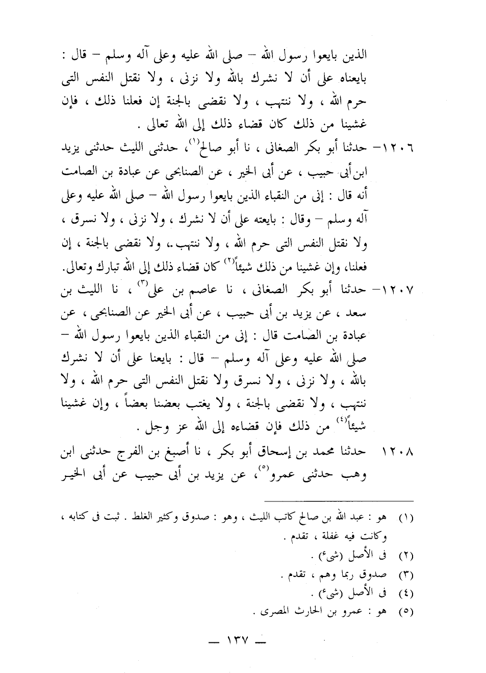 1206 - حَدَّثَنَا أَبُو بَكْرٍ الصَّغَانِيُّ، نا أَبُو صَالِحٍ، حَدَّثَنِي اللَّيْثُ، حَدَّثَنِي يَزِيدُ بْنُ أَبِي حَبِيبٍ، عَنْ أَبِي الْخَيْرِ، عَنِ الصُّنَابِحِيّ، عَنْ عُبَادَةَ بْنِ الصَّامِتِ، أَنَّهُ قَالَ: إِنِّي مِنَ النُّقَبَاءِ الَّذِينَ بَايَعُوا رَسُولَ اللَّهِ صَلَّى اللَّهُ عَلَيْهِ وَعَلَى آلِهِ وَسَلَّمَ وَقَالَ: §بَايَعْتُهُ عَلَى أَنْ لَا نُشْرِكَ، وَلَا نَزْنِيَ، وَلَا نَسْرِقَ، وَلَا نَقْتُلَ النَّفْسَ الَّتِي حَرَّمَ اللَّهُ، وَلَا نَنْتَهِبَ، وَلَا نَقْضِيَ بِالْجَنَّةِ، إِنْ فَعَلْنَا، وَإِنْ غَشِينَا مِنْ ذَلِكَ شَيْئًا كَانَ قَضَاءُ ذَلِكَ إِلَى اللَّهِ تَبَارَكَ وَتَعَالَى