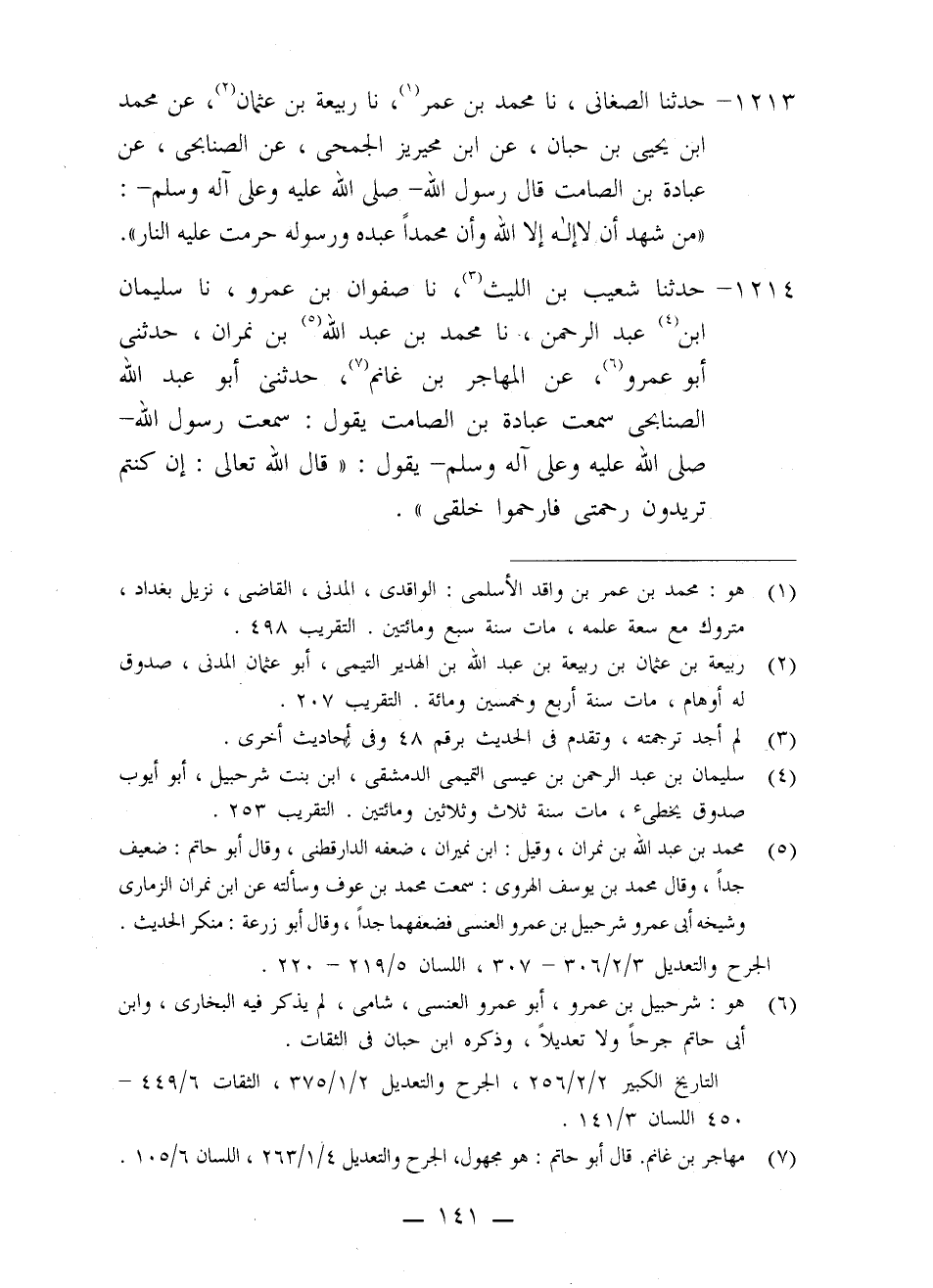 1213 - حَدَّثَنَا الصَّغَانِيُّ، نا مُحَمَّدُ بْنُ عُمَرَ، نا رَبِيعَةُ بْنُ عُثْمَانَ، عَنْ مُحَمَّدِ بْنِ يَحْيَى بْنِ حَبَّانَ، عَنِ ابْنِ مُحَيْرِيزٍ الْجُمَحِيِّ، عَنِ الصُّنَابِحِيّ، عَنْ عُبَادَةَ بْنِ الصَّامِتِ، قَالَ رَسُولُ اللَّهِ صَلَّى اللَّهُ عَلَيْهِ وَعَلَى آلِهِ وَسَلَّمَ: «§مَنْ شَهِدَ أَنْ لَا إِلَهَ إِلَّا اللَّهُ وَأَنَّ مُحَمَّدًا عَبْدُهُ وَرَسُولُهُ حُرِّمَتْ عَلَيْهِ النَّارُ»
