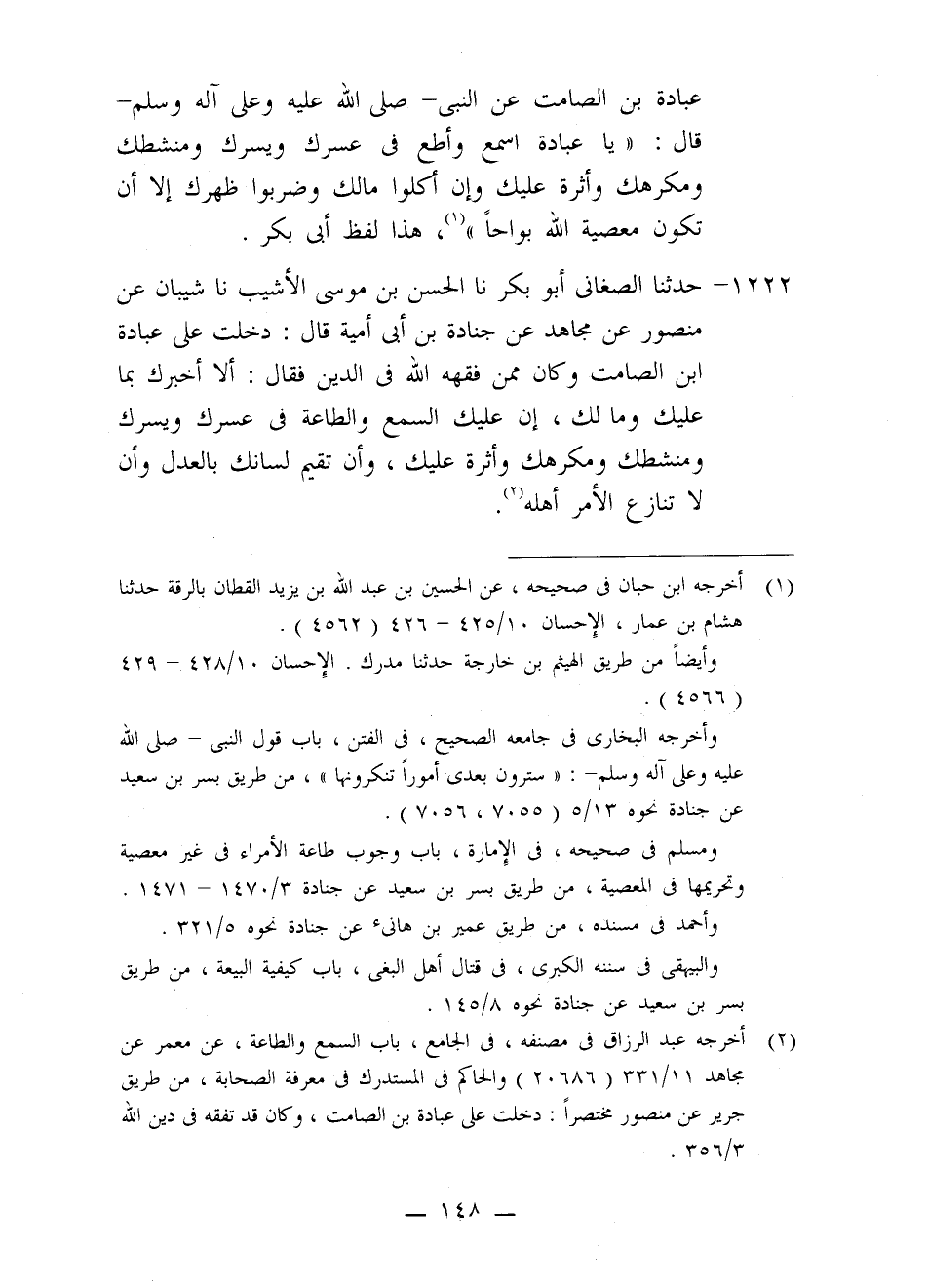 1222 - حَدَّثَنَا الصَّغَانِيُّ أَبُو بَكْرٍ، نا الْحَسَنُ بْنُ مُوسَى الْأَشْيَبُ، نا شَيْبَانُ، عَنْ مَنْصُورٍ، عَنْ مُجَاهِدٍ، عَنْ جُنَادَةَ بْنِ أَبِي أُمَيَّةَ، قَالَ: دَخَلْتُ عَلَى عُبَادَةَ بْنِ الصَّامِتِ وَكَانَ مِمَّنْ فَقَّهَهُ اللَّهُ فِي الدِّينِ فَقَالَ: «أَلَا أُخْبِرُكَ بِمَا عَلَيْكَ وَمَا لَكَ، إِنَّ §عَلَيْكَ السَّمْعَ وَالطَّاعَةَ فِي عُسْرِكَ وَيُسْرِكَ وَمَنْشَطِكَ وَمَكْرَهِكَ وَأَثَرَةٍ عَلَيْكَ، وَأَنْ تُقِيمَ لِسَانَكَ بِالْعَدْلِ , وَأَنْ لَا تَنَازِعَ الْأَمْرَ أَهْلَهُ»