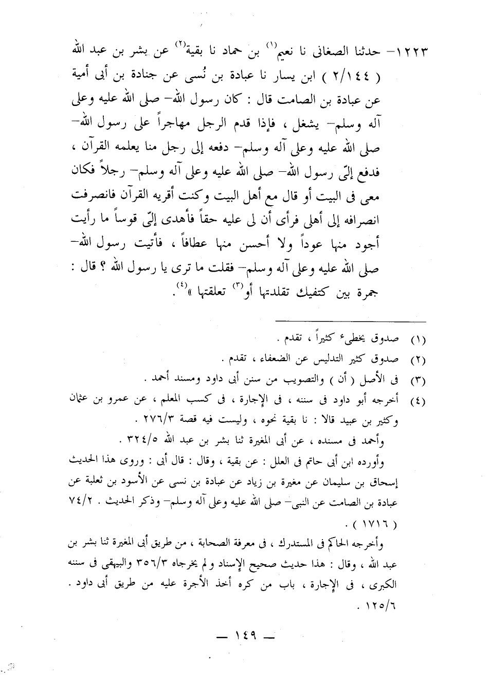 1223 - حَدَّثَنَا الصَّغَانِيُّ، نا نُعَيْمُ بْنُ حَمَّادٍ، نا بَقِيَّةُ، عَنْ بِشْرِ بْنِ عَبْدِ اللَّهِ بْنِ يَسَارٍ، نا عُبَادَةُ بْنُ نُسَيٍّ، عَنْ جُنَادَةَ بْنِ أَبِي أُمَيَّةَ، عَنْ عُبَادَةَ بْنِ الصَّامِتِ، قَالَ: كَانَ رَسُولُ اللَّهِ صَلَّى اللَّهُ عَلَيْهِ وَعَلَى آلِهِ وَسَلَّمَ يَشْغَلُ، فَإِذَا قَدِمَ الرَّجُلُ مُهَاجِرًا عَلَى رَسُولِ اللَّهِ صَلَّى اللَّهُ عَلَيْهِ وَعَلَى آلِهِ وَسَلَّمَ دَفَعَهُ إِلَى رَجُلٍ مِنَّا يُعَلِّمُهُ الْقُرْآنَ، فَدَفَعَ إِلَيَّ رَسُولُ اللَّهِ صَلَّى اللَّهُ عَلَيْهِ وَعَلَى آلِهِ وَسَلَّمَ رَجُلًا فَكَانَ مَعِي فِي الْبَيْتِ , أَوْ قَالَ مَعَ أَهْلِ الْبَيْتِ , وَكُنْتُ أُقْرِيهِ الْقُرْآنَ , فَانْصَرَفْتُ انْصِرَافَةً إِلَى أَهْلِي , فَرَأَى أَنَّ لِيَ عَلَيْهِ حَقًّا فَأَهْدَى إِلَيَّ قَوْسًا مَا رَأَيْتُ أَجْوَدَ مِنْهَا عُودًا وَلَا أَحْسَنَ مِنْهَا عِطَافًا، فَأَتَيْتُ رَسُولَ اللَّهِ صَلَّى اللَّهُ عَلَيْهِ وَعَلَى آلِهِ وَسَلَّمَ فَقُلْتُ: مَا تَرَى يَا رَسُولَ اللَّهِ؟ قَالَ: «§جَمْرَةٌ بَيْنَ كَتِفَيْكَ تَقَلَّدْتَهَا أَوْ تَعَلَّقْتَهَا»