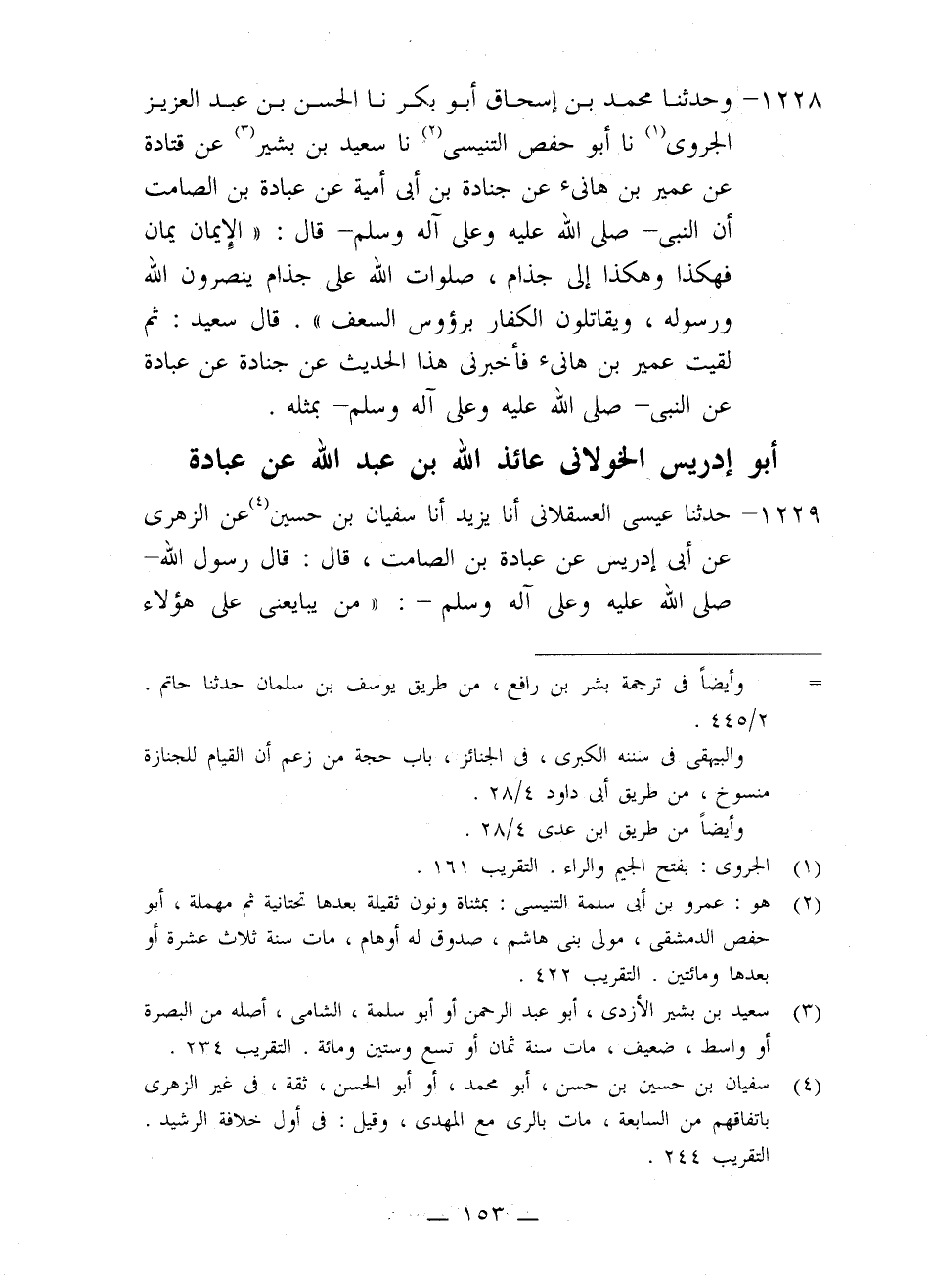 1228 - وَحَدَّثَنَا مُحَمَّدُ بْنُ إِسْحَاقَ أَبُو بَكْرٍ، نا الْحَسَنُ بْنُ عَبْدِ الْعَزِيزِ الْجَرَوِيُّ، نا أَبُو حَفْصٍ التِّنِّيسِيُّ، نا سَعِيدُ بْنُ بَشِيرٍ، عَنْ قَتَادَةَ، عَنْ عُمَيْرِ بْنِ هَانِئٍ، عَنْ جُنَادَةَ بْنِ أَبِي أُمَيَّةَ، عَنْ عُبَادَةَ بْنِ الصَّامِتِ، أَنَّ النَّبِيَّ صَلَّى اللَّهُ عَلَيْهِ وَعَلَى آلِهِ وَسَلَّمَ قَالَ: «§الْإِيمَانُ يَمَانٍ فَهَكَذَا وَهَكَذَا إِلَى جُذَامٍ، صَلَوَاتُ اللَّهِ عَلَى جُذَامٍ يُنْصَرُونَ اللَّهَ وَرَسُولَهُ، وَيُقَاتِلُونَ الْكُفَّارَ بِرُءُوسِ السَّعَفِ» قَالَ سَعِيدٌ: ثُمَّ لَقِيتُ عُمَيْرَ بْنَ هَانِئٍ فَأَخْبَرَنِي هَذَا الْحَدِيثَ عَنْ جُنَادَةَ، عَنْ عُبَادَةَ عَنِ النَّبِيِّ صَلَّى اللَّهُ عَلَيْهِ وَعَلَى آلِهِ وَسَلَّمَ، بِمِثْلِهِ