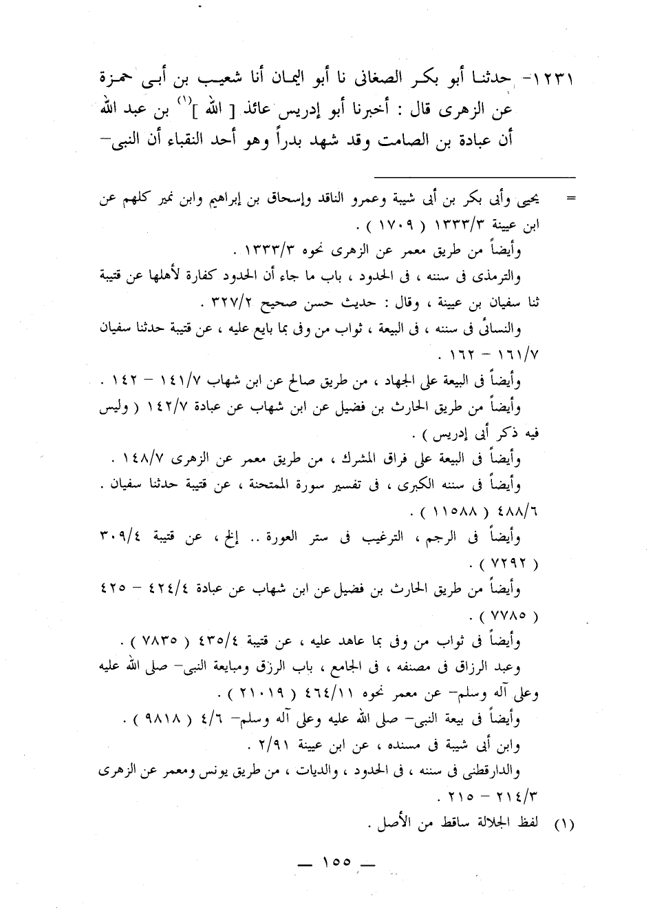 1231 - حَدَّثَنَا أَبُو بَكْرٍ الصَّغَانِيُّ، نا أَبُو الْيَمَانِ، أنا شُعَيْبُ بْنُ أَبِي حَمْزَةَ، عَنِ الزُّهْرِيِّ، قَالَ: أَخْبَرَنَا أَبُو إِدْرِيسَ عَائِذُ اللَّهِ بْنُ عَبْدِ اللَّهِ , أَنَّ عُبَادَةَ بْنَ الصَّامِتِ، وَقَدْ شَهِدَ بَدْرًا وَهُوَ أَحَدُ النُّقَبَاءِ , أَنَّ النَّبِيَّ صَلَّى اللَّهُ عَلَيْهِ وَعَلَى آلِهِ وَسَلَّمَ -[156]- قَالَ وَحَوْلَهُ عِصَابَةٌ مِنْ أَصْحَابِهِ: «§بَايِعُونِي عَلَى أَنْ لَا تُشْرِكُوا بِاللَّهِ شَيْئًا , وَلَا تَسْرِقُوا، وَلَا تَزْنُوا، وَلَا تَقْتُلُوا أَوْلَادَكُمْ، وَلَا تَأْتُوا بِبُهْتَانٍ تَفْتَرُونَهُ بَيْنَ أَيْدِيكُمْ وَأَرْجُلِكُمْ، وَلَا تَعْصُوا فِي مَعْرُوفٍ، مَنْ وَفَّى فَأَجْرُهُ عَلَى اللَّهِ، وَمَنْ أَصَابَ مِنْ ذَلِكَ شَيْئًا سَتَرَهُ اللَّهُ فَأَمْرُهُ إِلَى اللَّهِ , إِنْ شَاءَ عَفَا عَنْهُ , وَإِنْ شَاءَ عَاقَبَهُ» قَالَ: فَبَايَعْنَاهُ عَلَى ذَلِكَ
