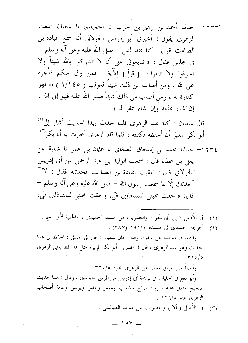 1233 - حَدَّثَنَا أَحْمَدُ بْنُ زُهَيْرِ بْنِ حَرْبٍ، نا الْحُمَيْدِيُّ، نا سُفْيَانُ، سَمِعْتُ الزُّهْرِيَّ، يَقُولُ: أَخْبَرَنِي أَبُو إِدْرِيسَ الْخَوْلَانِيُّ، أَنَّهُ سَمِعَ عُبَادَةَ بْنَ الصَّامِتِ، يَقُولُ: كُنَّا عِنْدَ النَّبِيِّ صَلَّى اللَّهُ عَلَيْهِ وَعَلَى آلِهِ وَسَلَّمَ فِي مَجْلِسٍ فَقَالَ: «§تُبَايِعُونِي عَلَى أَنْ لَا تُشْرِكُوا بِاللَّهِ شَيْئًا , وَلَا تَسْرِقُوا , وَلَا تَزْنُوا» ، قَرَأَ الْآيَةَ، «فَمَنْ وَفَّى مِنْكُمْ فَأَجْرُهُ عَلَى اللَّهِ، وَمَنْ أَصَابَ مِنْ ذَلِكَ شَيْئًا فَسَتَرَ اللَّهُ عَلَيْهِ فَهُوَ إِلَى اللَّهِ، إِنْ شَاءَ عَذَّبَهُ , وَإِنْ شَاءَ غَفَرَ لَهُ» . قَالَ سُفْيَانُ: كُنَّا عِنْدَ الزُّهْرِيِّ فَلَمَّا حَدَّثَ بِهَذَا الْحَدِيثِ أَشَارَ إِلَيَّ أَبُو بَكْرٍ الْهُذَلِيُّ أَنِ احْفَظْهُ فَكَتَبْتُهُ، فَلَمَّا قَامَ الزُّهْرِيُّ أَخْبَرْتُ بِهِ أَبَا بَكْرٍ