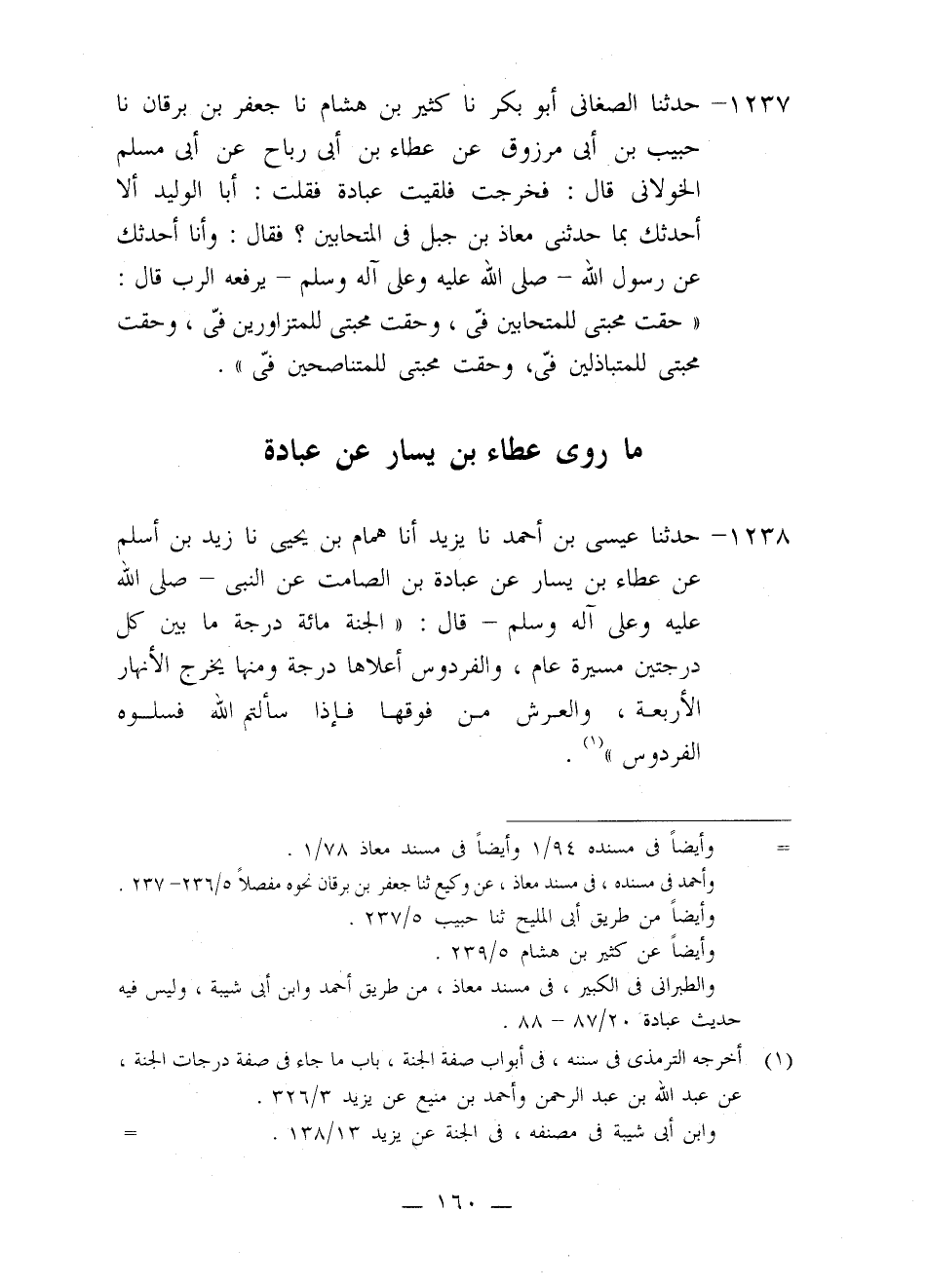 1238 - حَدَّثَنَا عِيسَى بْنُ أَحْمَدَ، نا يَزِيدُ، أنا هَمَّامُ بْنُ يَحْيَى، نا زَيْدُ بْنُ أَسْلَمَ، عَنْ عَطَاءِ بْنِ يَسَارٍ، عَنْ عُبَادَةَ بْنِ الصَّامِتِ، عَنِ النَّبِيِّ صَلَّى اللَّهُ عَلَيْهِ وَعَلَى آلِهِ وَسَلَّمَ، قَالَ: «§الْجَنَّةُ مِائَةُ دَرَجَةٍ مَا بَيْنَ كُلِّ دَرَجَتَيْنِ مَسِيرَةُ مِائَةِ عَامٍ، وَالْفِرْدَوْسُ أَعْلَاهَا دَرَجَةً , وَمِنْهَا يَخْرُجُ الْأَنْهَارُ الْأَرْبَعَةُ، وَالْعَرْشُ مِنْ فَوْقِهَا فَإِذَا سَأَلْتُمُ اللَّهَ فَسَلُوهُ الْفِرْدَوْسَ»
