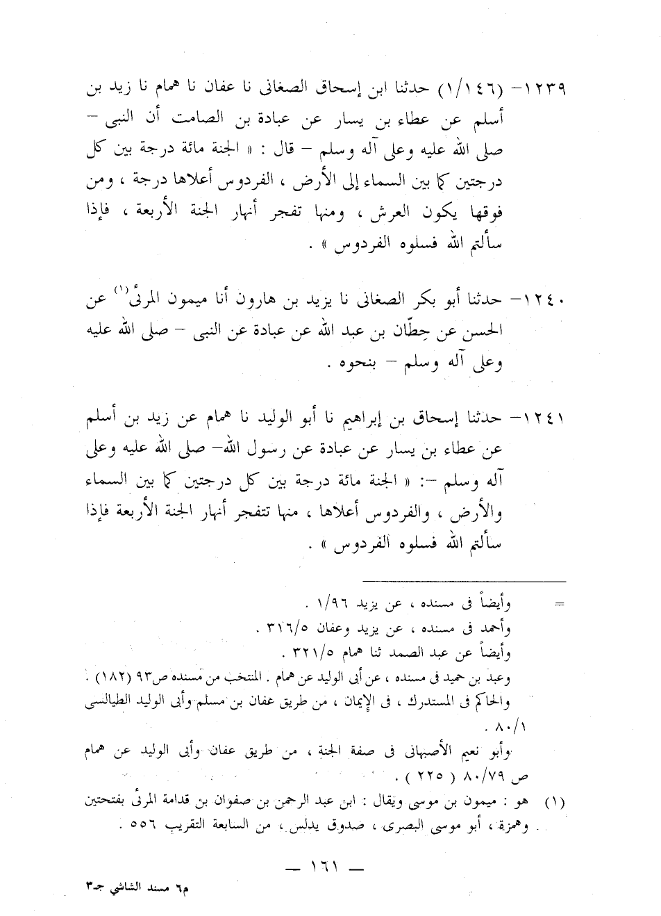 1239 - حَدَّثَنَا ابْنُ إِسْحَاقَ الصَّغَانِيُّ، نا عَفَّانُ، نا هَمَّامٌ، نا زَيْدُ بْنُ أَسْلَمَ، عَنْ عَطَاءِ بْنِ يَسَارٍ، عَنْ عُبَادَةَ بْنِ الصَّامِتِ، أَنَّ النَّبِيَّ صَلَّى اللَّهُ عَلَيْهِ وَعَلَى آلِهِ وَسَلَّمَ قَالَ: «§الْجَنَّةُ مِائَةُ دَرَجَةٍ بَيْنَ كُلِّ دَرَجَتَيْنِ كَمَا بَيْنَ السَّمَاءِ إِلَى الْأَرْضِ، الْفِرْدَوْسُ أَعْلَاهَا دَرَجَةً، وَمِنْ فَوْقِهَا يَكُونُ الْعَرْشُ، وَمِنْهَا تَفَجَّرُ أَنْهَارُ الْجَنَّةِ الْأَرْبَعَةِ، فَإِذَا سَأَلْتُمُ اللَّهَ فَسَلُوهُ الْفِرْدَوْسَ»