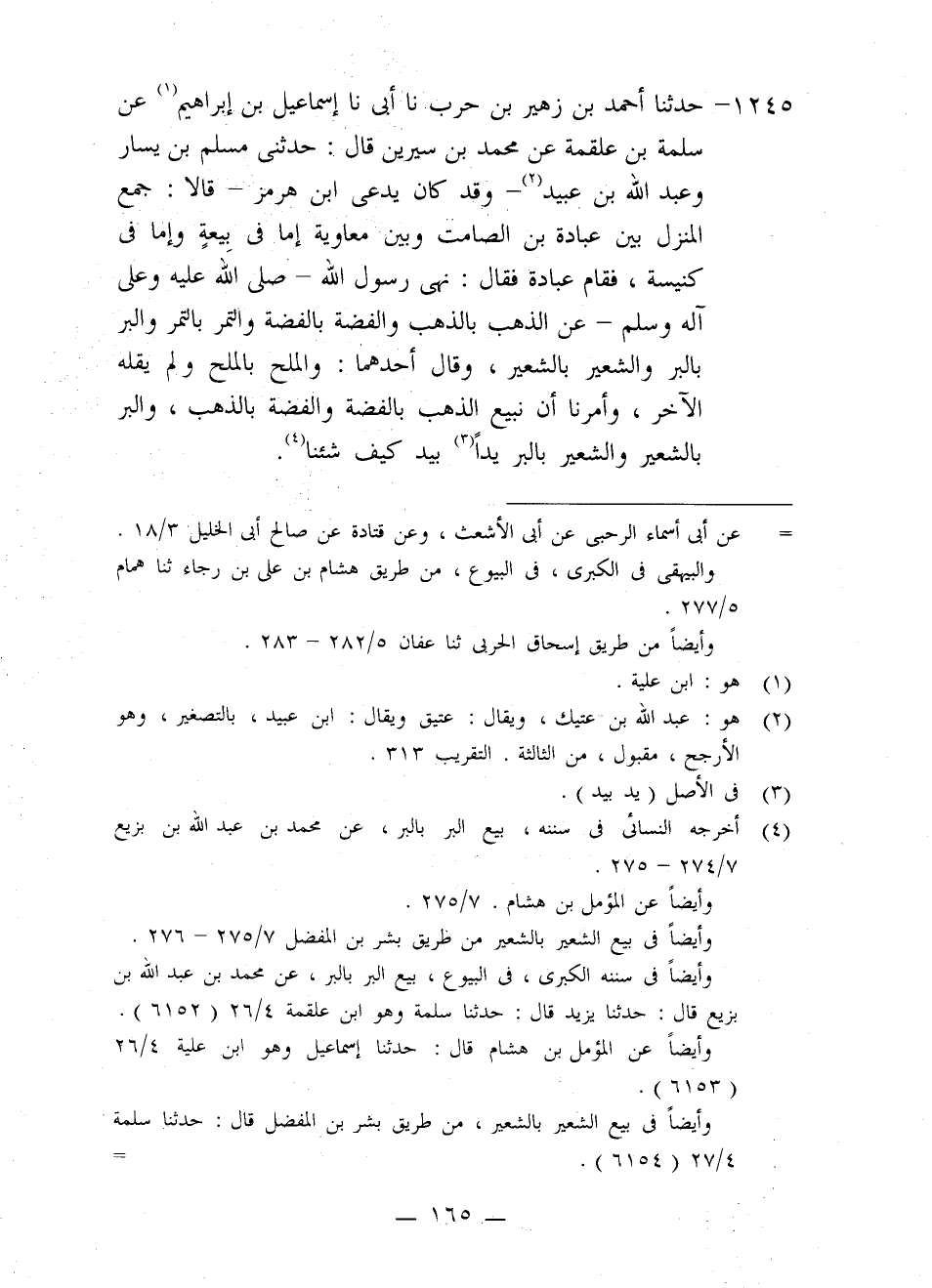 1245 - حَدَّثَنَا أَحْمَدُ بْنُ زُهَيْرِ بْنِ حَرْبٍ، نا أَبِي، نا إِسْمَاعِيلُ بْنُ إِبْرَاهِيمَ، عَنْ سَلَمَةَ بْنِ عَلْقَمَةَ، عَنْ مُحَمَّدِ بْنِ سِيرِينَ، قَالَ: حَدَّثَنِي مُسْلِمُ بْنُ يَسَارٍ، وَعَبْدُ اللَّهِ بْنُ عُبَيْدٍ، وَقَدْ كَانَ يُدْعَى ابْنَ هُرْمُزٍ، قَالَا: جَمَعَ الْمَنْزِلُ بَيْنَ عُبَادَةَ بْنِ الصَّامِتِ وَبَيْنَ مُعَاوِيَةَ إِمَّا فِي بَيْعَةٍ وَإِمَّا فِي كَنِيسَةٍ فَقَامَ عُبَادَةُ فَقَالَ: «§نَهَى رَسُولُ اللَّهِ صَلَّى اللَّهُ عَلَيْهِ وَعَلَى آلِهِ وَسَلَّمَ عَنِ الذَّهَبِ بِالذَّهَبِ , وَالْفِضَّةِ بِالْفِضَّةِ , وَالتَّمْرِ بِالتَّمْرِ , وَالْبُرِّ بِالْبُرِّ , وَالشَّعِيرِ بِالشَّعِيرِ» ، وَقَالَ أَحَدُهُمَا: وَالْمِلْحِ بِالْمِلْحِ، وَلَمْ يَقُلْهُ الْآخَرُ، «وَأَمَرَنَا أَنْ نَبِيعَ الذَّهَبَ بِالْفِضَّةِ , وَالْفِضَّةَ بِالذَّهَبِ، وَالْبُرَّ بِالشَّعِيرِ , وَالشَّعِيرَ بِالْبُرِّ يَدًا بِيَدٍ كَيْفَ شِئْنَا»