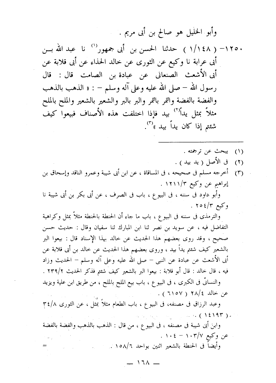 1250 - حَدَّثَنَا الْحَسَنُ بْنُ أَبِي جُمْهُورٍ، نا عَبْدُ اللَّهِ بْنُ أَبِي عَرَابَةَ، نا وَكِيعٌ، عَنِ الثَّوْرِيِّ، عَنْ خَالِدٍ الْحَذَّاءِ، عَنْ أَبِي قِلَابَةَ، عَنْ أَبِي الْأَشْعَثِ الصَّنْعَانِيِّ، عَنْ عُبَادَةَ بْنِ الصَّامِتِ، قَالَ: قَالَ رَسُولُ اللَّهِ صَلَّى اللَّهُ عَلَيْهِ وَعَلَى آلِهِ وَسَلَّمَ: «§الذَّهَبُ بِالذَّهَبِ , وَالْفِضَّةُ بِالْفِضَّةِ , وَالتَّمْرُ بِالتَّمْرِ , وَالْبُرُّ بِالْبُرِّ , وَالشَّعِيرُ بِالشَّعِيرِ , وَالْمِلْحُ بِالْمِلْحِ , مِثْلًا بِمِثْلٍ , يَدًا بِيَدٍ , فَإِذَا اخْتَلَفَتْ هَذِهِ الْأَصْنَافُ فَبِيعُوا كَيْفَ شِئْتُمْ إِذَا كَانَ يَدًا بِيَدٍ»