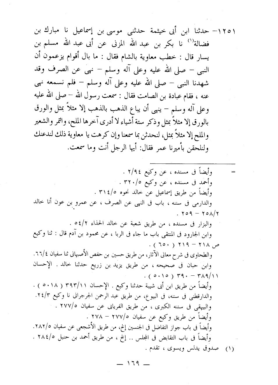 1251 - حَدَّثَنَا ابْنُ أَبِي خَيْثَمَةَ، حَدَّثَنِي مُوسَى بْنُ إِسْمَاعِيلَ، نا مُبَارَكُ بْنُ فَضَالَةَ، نا بَكْرُ بْنُ عَبْدِ اللَّهِ الْمُزَنِيُّ، عَنْ أَبِي عَبْدِ اللَّهِ مُسْلِمِ بْنِ يَسَارٍ قَالَ: خَطَبَ مُعَاوِيَةُ بِالشَّامِ فَقَالَ: مَا بَالُ أَقْوَامٍ يَزْعُمُونَ أَنَّ النَّبِيَّ صَلَّى اللَّهُ عَلَيْهِ وَعَلَى آلِهِ وَسَلَّمَ نَهَى عَنِ الصَّرْفِ وَقَدْ شَهِدْنَا النَّبِيَّ صَلَّى اللَّهُ عَلَيْهِ وَعَلَى آلِهِ وَسَلَّمَ فَلَمْ نَسْمَعْهُ نَهَى عَنْهُ؟ فَقَامَ عُبَادَةُ بْنُ الصَّامِتِ فَقَالَ: سَمِعْتُ رَسُولَ اللَّهِ صَلَّى اللَّهُ عَلَيْهِ وَعَلَى آلِهِ وَسَلَّمَ §يَنْهَى أَنْ يُبَاعَ الذَّهَبُ بِالذَّهَبِ إِلَّا مِثْلًا بِمِثْلٍ , وَالْوَرِقُ بِالْوَرِقِ إِلَّا مِثْلًا بِمِثْلٍ , وَذَكَرَ سِتَّةَ أَشْيَاءَ لَا أَدْرِي آخِرَهَا، الْمِلْحَ , وَالتَّمْرُ وَالشَّعِيرُ وَالْمِلْحُ إِلَّا مِثْلًا بِمِثْلٍ. لَنُحَدِّثَنَّ بِمَا سَمِعْنَا وَإِنْ كَرِهْتَ يَا مُعَاوِيَةُ ذَلِكَ لَنَدَعَنَّكَ وَلَنَلْحَقَنَّ بِأَمِيرِنَا عُمَرَ فَقَالَ: أَيُّهَا الرَّجُلُ أَنْتَ وَمَا سَمِعْتَ
