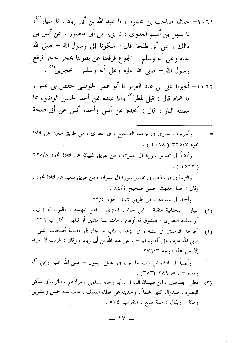 1061 - حَدَّثَنَا صَاحِبُ بْنُ مَحْمُودٍ، نا عَبْدُ اللَّهِ بْنُ أَبِي زِيَادٍ، نا سَيَّارٌ، نا سَهْلُ بْنُ أَسْلَمَ الْعَدَوِيُّ، نا يَزِيدُ بْنُ أَبِي مَنْصُورٍ، عَنْ أَنَسِ بْنِ مَالِكٍ، عَنْ أَبِي طَلْحَةَ، قَالَ: شَكَوْنَا إِلَى رَسُولِ اللَّهِ صَلَّى اللَّهُ عَلَيْهِ وَعَلَى آلِهِ وَسَلَّمَ الْجُوعَ , §فَرَفَعْنَا عَنْ بُطُونِنَا بِحَجَرٍ حَجَرٍ , فَرَفَعَ رَسُولُ اللَّهِ صَلَّى اللَّهُ عَلَيْهِ وَعَلَى آلِهِ وَسَلَّمَ بِحَجَرَيْنِ
