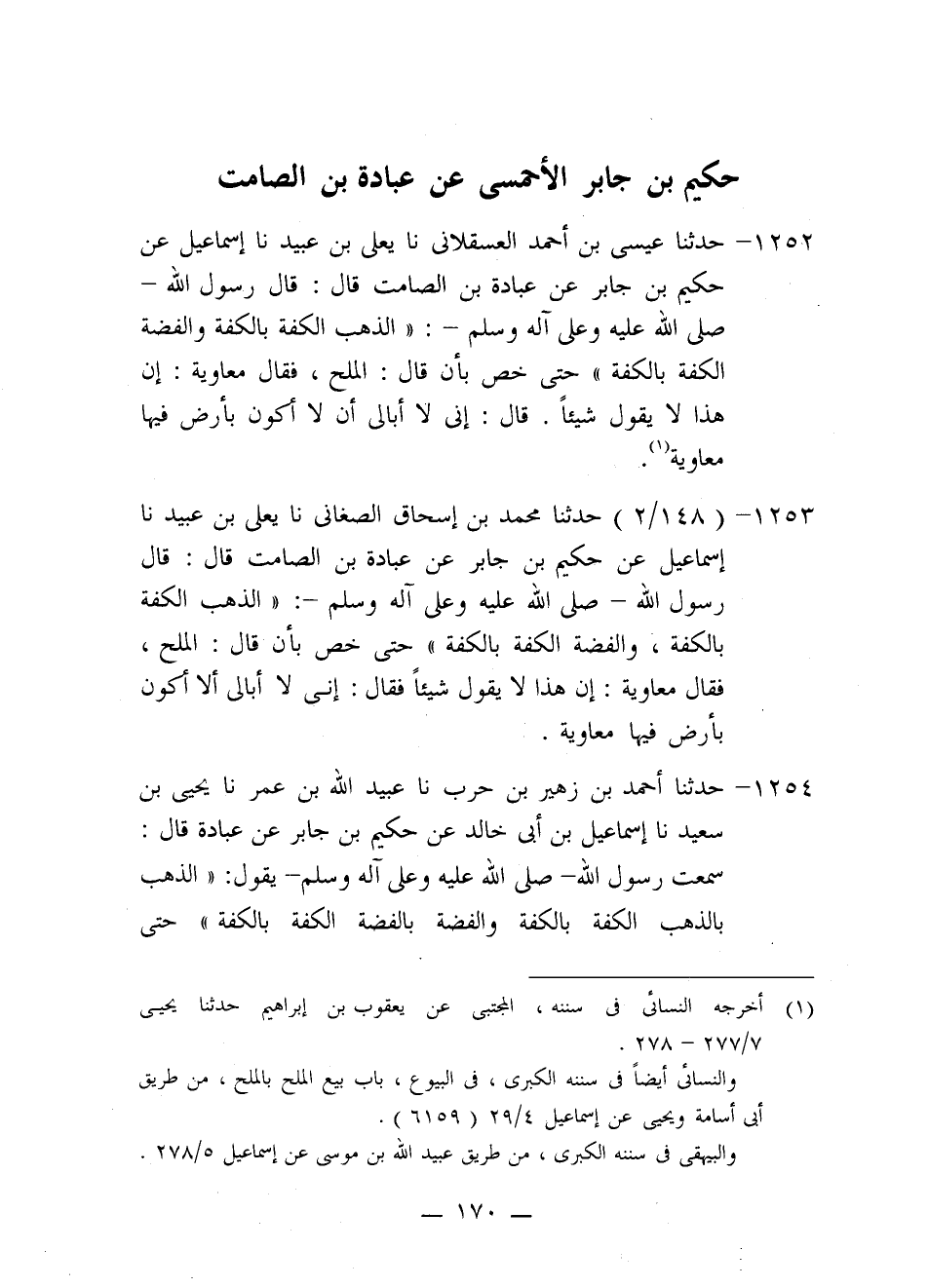 1253 - حَدَّثَنَا مُحَمَّدُ بْنُ إِسْحَاقَ الصَّغَانِيُّ، نا يَعْلَى بْنُ عُبَيْدٍ، نا إِسْمَاعِيلُ، عَنْ حَكِيمِ بْنِ جَابِرٍ، عَنْ عُبَادَةَ بْنِ الصَّامِتِ، قَالَ: قَالَ رَسُولُ اللَّهِ صَلَّى اللَّهُ عَلَيْهِ وَعَلَى آلِهِ وَسَلَّمَ: «§الذَّهَبُ الْكِفَّةُ بِالْكِفَّةِ، وَالْفِضَّةُ الْكِفَّةُ بِالْكِفَّةِ» , حَتَّى خَصَّ بِأَنْ قَالَ: «الْمِلْحُ» . فَقَالَ مُعَاوِيَةُ: إِنَّ هَذَا لَا يَقُولُ شَيْئًا. فَقَالَ: إِنِّي لَا أُبَالِي أَلَّا أَكُونَ بِأَرْضٍ فِيهَا مُعَاوِيَةُ