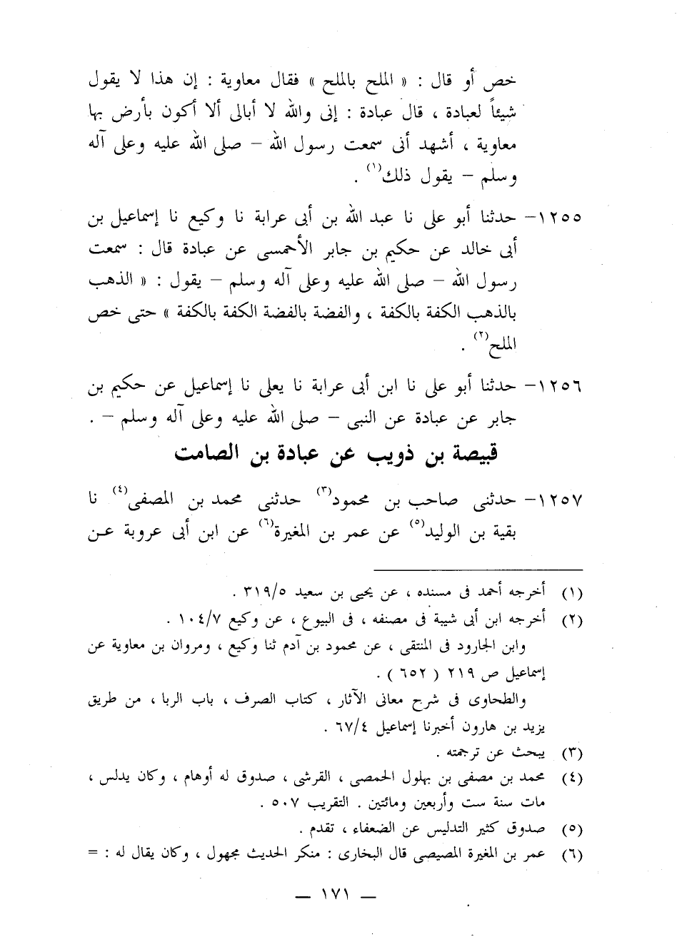 1255 - حَدَّثَنَا أَبُو عَلِيٍّ، نا عَبْدُ اللَّهِ بْنُ أَبِي عَرَابَةَ، نا وَكِيعٌ، نا إِسْمَاعِيلُ بْنُ أَبِي خَالِدٍ، عَنْ حَكِيمِ بْنِ جَابِرٍ الْأَحْمَسِيِّ، عَنْ عُبَادَةَ، قَالَ: سَمِعْتُ رَسُولَ اللَّهِ صَلَّى اللَّهُ عَلَيْهِ وَعَلَى آلِهِ وَسَلَّمَ يَقُولُ: «§الذَّهَبُ بِالذَّهَبِ الْكِفَّةُ بِالْكِفَّةِ، وَالْفِضَّةُ بِالْفِضَّةِ الْكِفَّةُ بِالْكِفَّةِ» حَتَّى خَصَّ الْمِلْحَ.