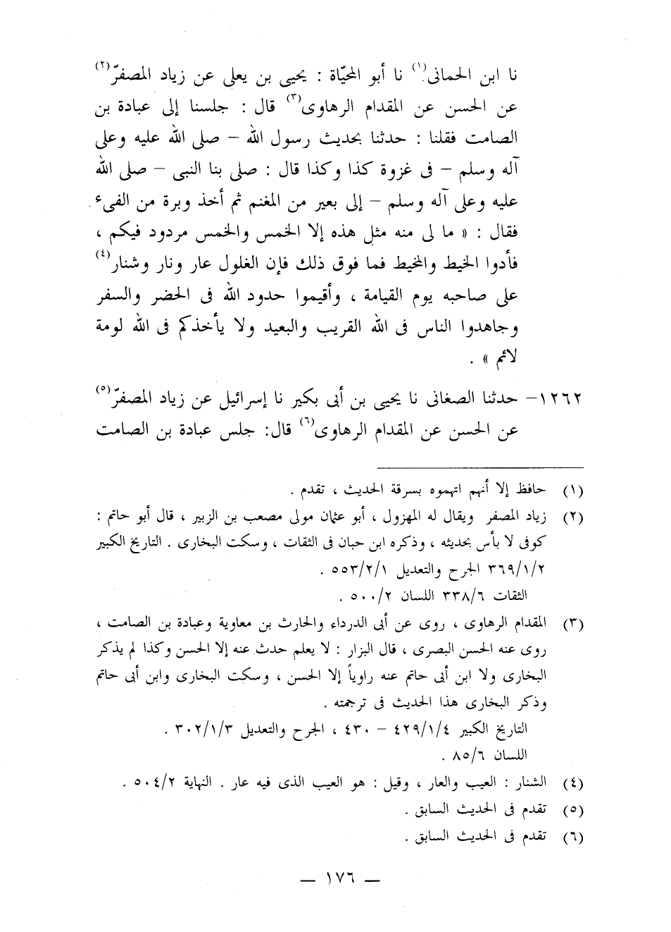 1262 - حَدَّثَنَا الصَّغَانِيُّ، نا يَحْيَى بْنُ أَبِي بُكَيْرٍ، نا إِسْرَائِيلُ، عَنْ زِيَادٍ الْمُصَفَّرِ، عَنِ الْحَسَنِ، عَنِ الْمِقْدَامِ الرَّهَاوِيِّ، قَالَ: جَلَسَ عُبَادَةُ بْنُ الصَّامِتِ -[177]-، وَأَبُو الدَّرْدَاءِ، وَالْحَارِثُ بْنُ مُعَاوِيَةَ الْكِنْدِيُّ , فَقَالَ أَبُو الدَّرْدَاءِ: أَيُّكُمْ يَذْكُرُ يَوْمَ صَلَّى رَسُولُ اللَّهِ صَلَّى اللَّهُ عَلَيْهِ وَعَلَى آلِهِ وَسَلَّمَ إِلَى بَعِيرٍ مِنَ الْمَغْنَمِ؟ فَقَالَ عُبَادَةُ: أَنَا قَالُ: فَحَدِّثْ، قَالَ: صَلَّى بِنَا رَسُولُ اللَّهِ صَلَّى اللَّهُ عَلَيْهِ وَعَلَى آلِهِ وَسَلَّمَ إِلَى بَعِيرٍ مِنَ الْمَغْنَمِ فَلَمَّا انْفَتَلَ تَنَاوَلَ بِيَدِهِ قَرَدَةً مِنْ وَبَرِ الْبَعِيرِ ثُمَّ أَقْبَلَ عَلَيْنَا فَقَالَ: «إِنَّهُ §لَا يَحِلُّ لِي مِنْ غَنَائِمِكُمْ مَا يَزِنُ هَذِهِ بَعْدَ الْخُمُسِ وَهُوَ مَرْدُودٌ عَلَيْكُمْ»