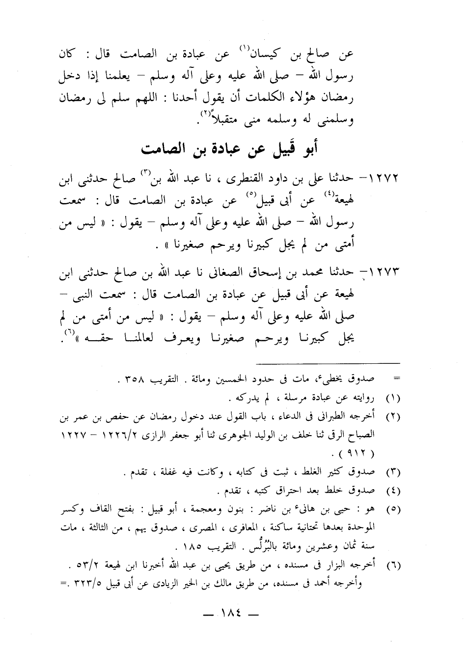 1273 - حَدَّثَنَا مُحَمَّدُ بْنُ إِسْحَاقَ الصَّغَانِيُّ، حَدَّثَنَا عَبْدُ اللَّهِ بْنُ صَالِحٍ، حَدَّثَنِي ابْنُ لَهِيعَةَ، عَنْ أَبِي قَبِيلٍ، عَنْ عُبَادَةَ بْنِ الصَّامِتِ، قَالَ: سَمِعْتُ النَّبِيَّ صَلَّى اللَّهُ عَلَيْهِ وَعَلَى آلِهِ وَسَلَّمَ يَقُولُ: «§لَيْسَ مِنْ أُمَّتِي مَنْ لَمْ يُجِلَّ كَبِيرَنَا وَيَرْحَمْ صَغِيرَنَا وَيَعْرِفْ لِعَالِمِنَا حَقَّهُ»