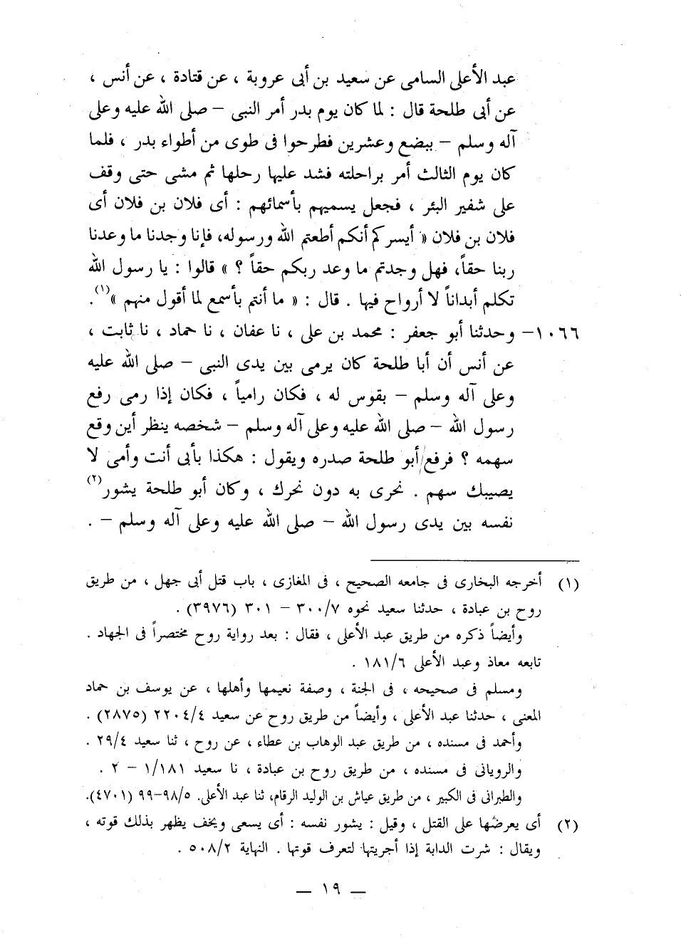 1066 - وَحَدَّثَنَا أَبُو جَعْفَرٍ مُحَمَّدُ بْنُ عَلِيٍّ، نا عَفَّانُ، نا حَمَّادٌ، نا ثَابِتٌ، عَنْ أَنَسٍ، أَنَّ أَبَا طَلْحَةَ كَانَ §يَرْمِي بَيْنَ يَدَيِ النَّبِيِّ صَلَّى اللَّهُ عَلَيْهِ وَعَلَى آلِهِ وَسَلَّمَ بِقَوْسٍ لَهُ، فَكَانَ رَامِيًا، فَكَانَ إِذَا رَمَى رَفَعَ رَسُولُ اللَّهِ صَلَّى اللَّهُ عَلَيْهِ وَعَلَى آلِهِ وَسَلَّمَ شَخْصَهُ يَنْظُرُ أَيْنَ وَقَعَ سَهْمُهُ، فَرَفَعَ أَبُو طَلْحَةَ صَدْرَهُ وَيَقُولُ: هَكَذَا بِأَبِي أَنْتَ وَأُمِّي لَا يُصِيبُكَ سَهْمٌ، نَحْرِي بِهِ دُونَ نَحْرِكَ، وَكَانَ أَبُو طَلْحَةَ يَشُورُ نَفْسَهُ بَيْنَ يَدَيْ رَسُولِ اللَّهِ صَلَّى اللَّهُ عَلَيْهِ وَعَلَى آلِهِ وَسَلَّمَ -[20]- يَقُولُ: إِنِّي جَلْدٌ يَا رَسُولَ اللَّهِ فَوَجِّهْنِي فِي حَوَائِجِكَ وَمُرْنِي بِمَا شِئْتَ