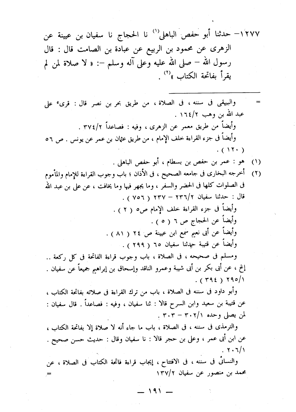 1277 - حَدَّثَنَا أَبُو حَفْصٍ الْبَاهِلِيُّ، نا الْحَجَّاجُ، نا سُفْيَانُ بْنُ عُيَيْنَةَ، عَنِ الزُّهْرِيِّ، عَنْ مَحْمُودِ بْنِ الرَّبِيعِ، عَنْ عُبَادَةَ بْنِ الصَّامِتِ قَالَ: قَالَ رَسُولُ اللَّهِ صَلَّى اللَّهُ عَلَيْهِ وَعَلَىَ آلِهِ وَسَلَّمَ: «§لَا صَلَاةَ لِمَنْ لَمْ يَقْرَأْ بِفَاتِحَةِ الْكِتَابِ»