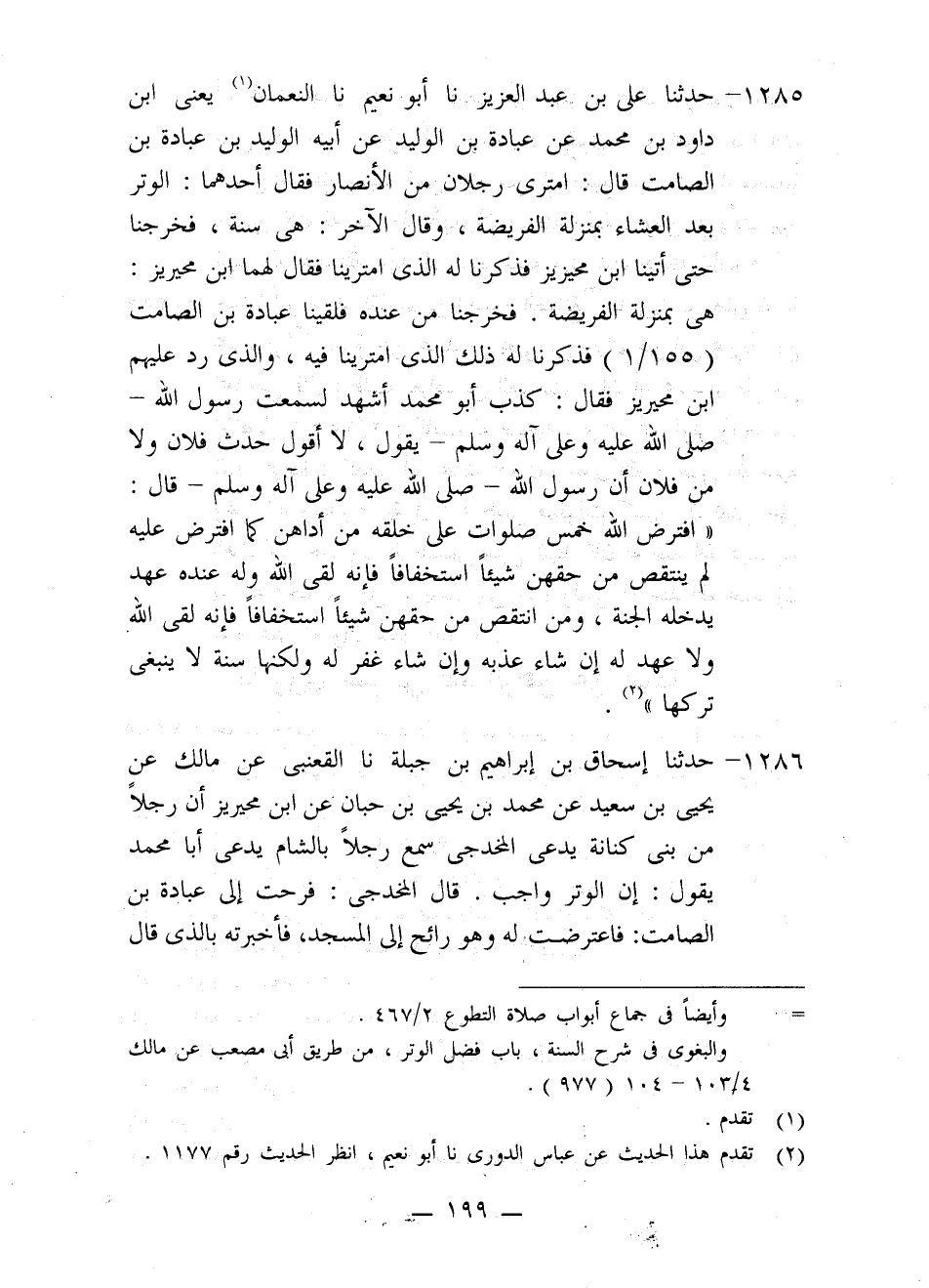 1285 - حَدَّثَنَا عَلِيُّ بْنُ عَبْدِ الْعَزِيزِ، نا أَبُو نُعَيْمٍ، نا النُّعْمَانُ يَعْنِي ابْنَ دَاوُدَ بْنِ مُحَمَّدٍ، عَنْ عُبَادَةَ بْنِ الْوَلِيدِ، عَنْ أَبِيهِ الْوَلِيدِ بْنِ عُبَادَةَ بْنِ الصَّامِتِ، قَالَ: امْتَرَى رَجُلَانِ مِنَ الْأَنْصَارِ فَقَالَ أَحَدُهُمَا: الْوَتْرُ بَعْدَ الْعِشَاءِ بِمَنْزِلَةِ الْفَرِيضَةِ، وَقَالَ الْآخَرُ: هِيَ سَنَةٌ، فَخَرَجْنَا حَتَّى أَتَيْنَا ابْنَ مُحَيْرِيزٍ فَذَكَرْنَا لَهُ الَّذِي امْتَرَيْنَا فَقَالَ لَهُمَا ابْنُ مُحَيْرِيزٍ هِيَ بِمَنْزِلَةِ الْفَرِيضَةِ. فَخَرَجْنَا مِنْ عِنْدِهِ فَلَقِينَا عُبَادَةَ بْنَ الصَّامِتِ فَذَكَرْنَا لَهُ ذَلِكَ الَّذِي امْتَرَيْنَا فِيهِ، وَالَّذِي رَدَّ عَلَيْهِمُ ابْنُ مُحَيْرِيزٍ، فَقَالَ: كَذَبَ أَبُو مُحَمَّدٍ، أَشْهَدُ لَسَمِعْتُ رَسُولَ اللَّهِ صَلَّى اللَّهُ عَلَيْهِ وَعَلَى آلِهِ وَسَلَّمَ يَقُولُ، لَا أَقُولُ حَدَّثَ فُلَانٌ وَلَا مِنْ فُلَانٍ أَنَّ رَسُولَ اللَّهِ صَلَّى اللَّهُ عَلَيْهِ وَعَلَى آلِهِ وَسَلَّمَ قَالَ: «§افْتَرَضَ اللَّهُ خَمْسَ صَلَوَاتٍ عَلَى خَلْقِهِ مِنْ أَدَّاهُنَّ كَمَا افْتُرِضَ عَلَيْهِ لَمْ يَنْتَقِصْ مِنْ حَقِّهِنَّ شَيْئًا اسْتِخْفَافًا فَإِنَّهُ لَقِيَ اللَّهَ وَلَهُ عِنْدَهُ عَهْدٌ يُدْخِلُهُ الْجَنَّةَ، وَمَنِ انْتَقَصَ مِنْ حَقِّهِنَّ شَيْئًا اسْتِخْفَافًا فَإِنَّهُ لَقِيَ اللَّهَ وَلَا عَهْدَ لَهُ، إِنْ شَاءَ عَذَّبَهُ وَإِنْ شَاءَ غَفَرَ لَهُ» وَلَكِنَّهَا سُنَّةٌ لَا يَنْبَغِي تَرْكُهَا