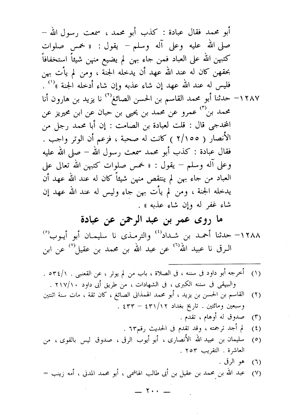 1287 - حَدَّثَنَا أَبُو مُحَمَّدٍ الْقَاسِمُ ابْنُ الْحَسَنِ الصَّائِغُ، نا يَزِيدُ بْنُ هَارُونَ، أَنَا مُحَمَّدُ بْنُ عَمْرٍو، عَنْ مُحَمَّدِ بْنِ يَحْيَى بْنِ حَبَّانَ، عَنِ ابْنِ مُحَيْرِيزٍ، عَنِ الْمُخْدَجِيِّ، قَالَ: قُلْتُ لِعُبَادَةَ بْنِ الصَّامِتِ: إِنَّ أَبَا مُحَمَّدٍ رَجُلٌ مِنَ الْأَنْصَارِ كَانَتْ لَهُ صُحْبَةٌ، فَزَعَمَ أَنَّ الْوَتْرَ وَاجِبٌ، فَقَالَ عُبَادَةُ: كَذَبَ أَبُو مُحَمَّدٍ، سَمِعْتُ رَسُولَ اللَّهِ صَلَّى اللَّهُ عَلَيْهِ وَعَلَى آلِهِ وَسَلَّمَ يَقُولُ: «§خَمْسُ صَلَوَاتٍ كَتَبَهُنَّ اللَّهُ تَعَالَى عَلَى الْعِبَادِ، مَنْ جَاءَ بِهِنَّ لَمْ يَنْتَقِصْ مِنْهُنَّ شَيْئًا كَانَ لَهُ عِنْدَ اللَّهِ عَهْدٌ أَنْ يُدْخِلَهُ الْجَنَّةَ، وَمَنْ لَمْ يَأْتِ بِهِنَّ جَاءَ وَلَيْسَ لَهُ عِنْدَ اللَّهِ عَهْدٌ، إِنْ شَاءَ غَفَرَ لَهُ وَإِنْ شَاءَ عَذَّبَهُ»